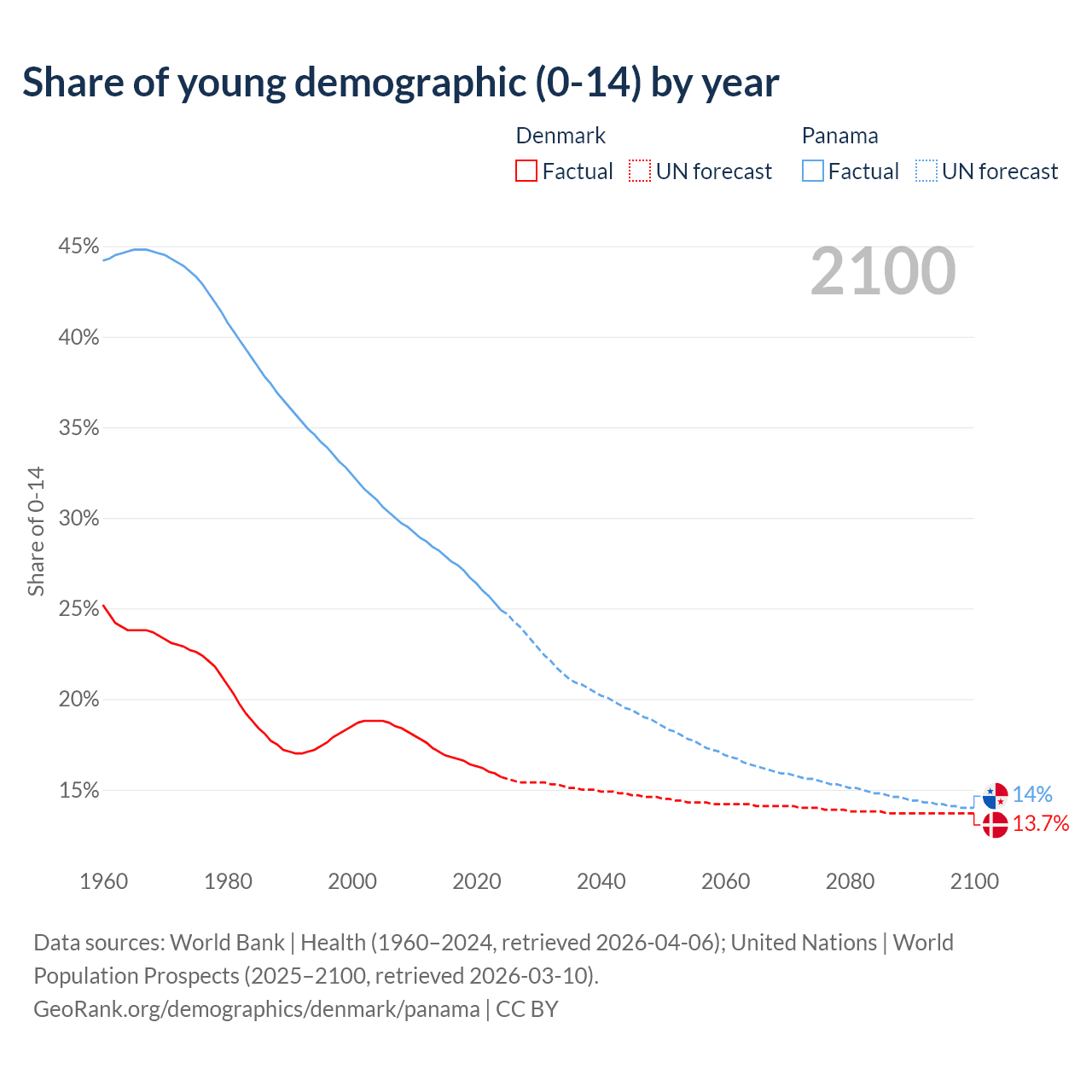 - The share of young demographic (0-15 years old) in Denmark is 15.7% vs 24.9% in Panama.