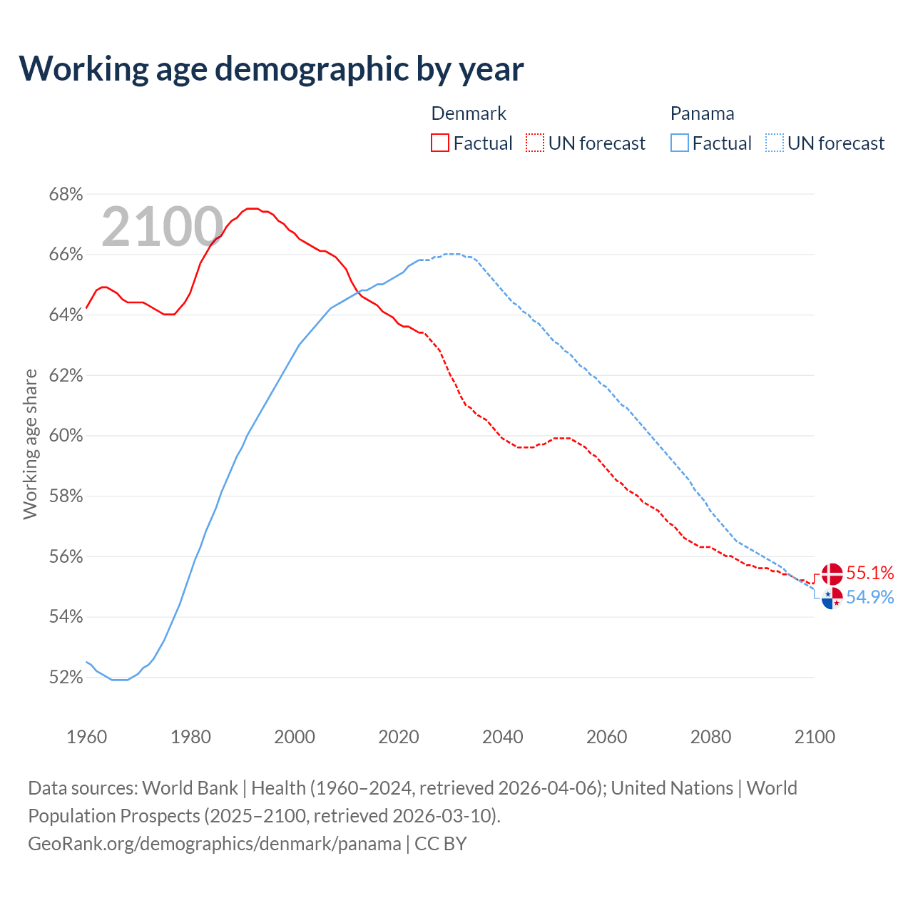 - Denmark has 3.83M working age adults (aged 15-64) vs 3.05M in Panama.