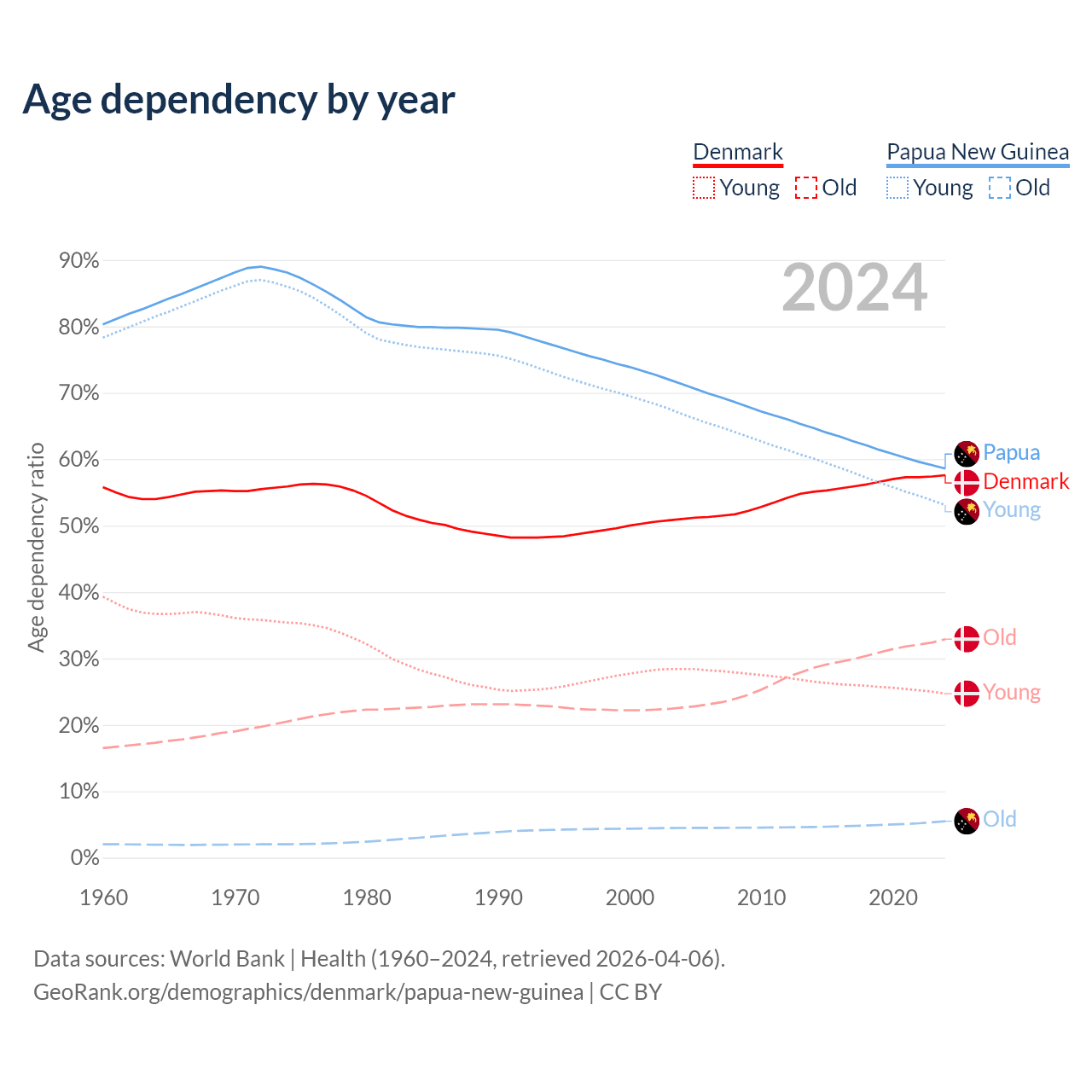 - The share of old-age demographic (65+) in Denmark is 20.9% vs 3.46% in Papua New Guinea.