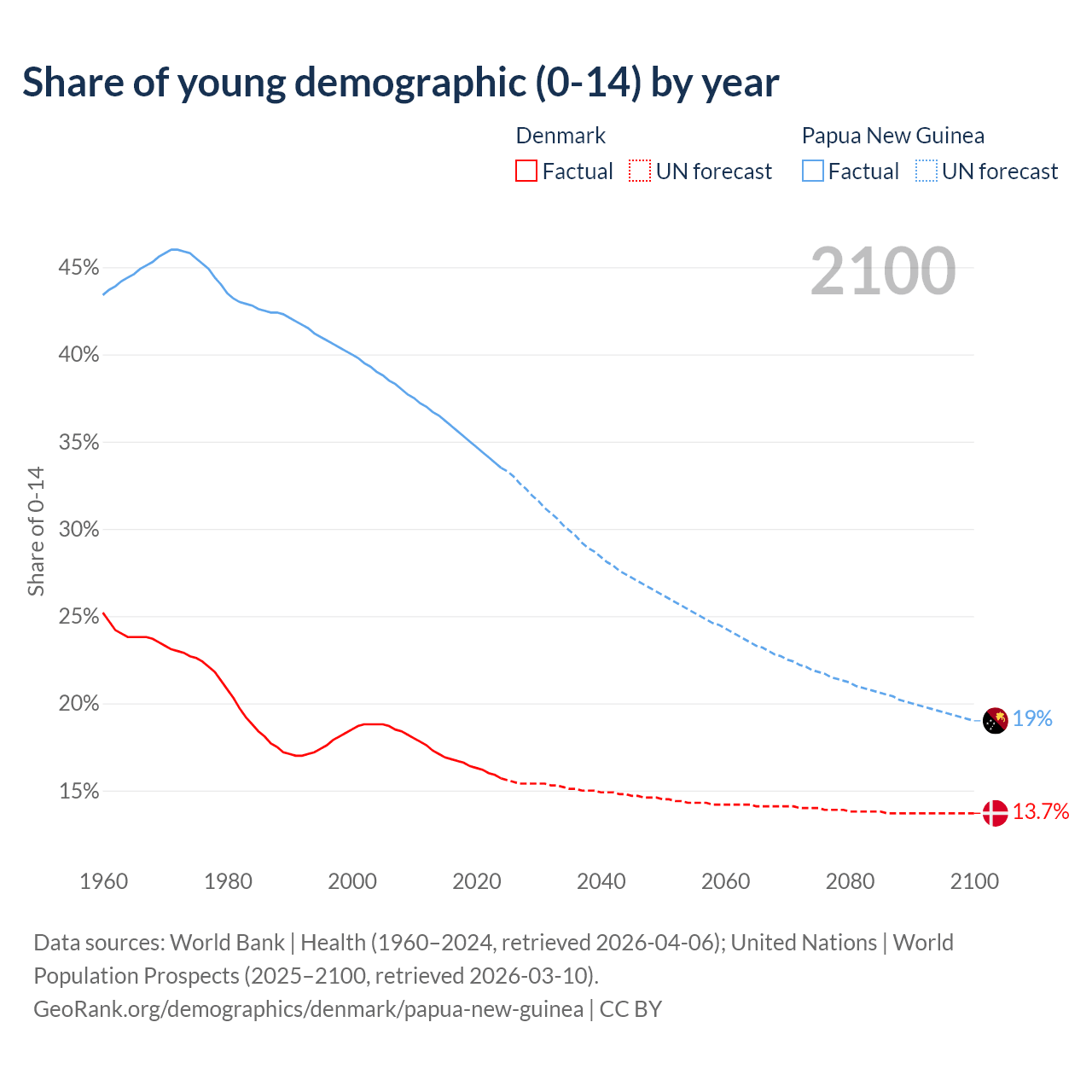 - The share of young demographic (0-15 years old) in Denmark is 15.7% vs 33.5% in Papua New Guinea.