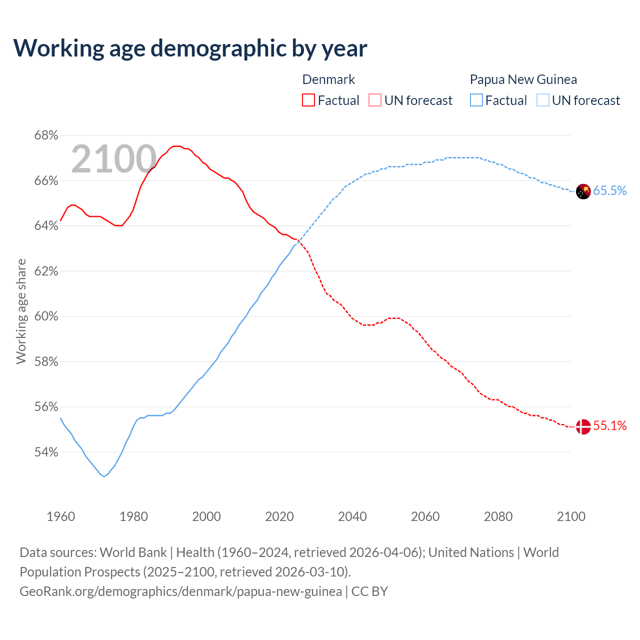 The share of older people aged 65 and over is 20.9% in Denmark and 3.46% in Papua New Guinea. Life expectancy in Denmark compared to Papua New Guinea .