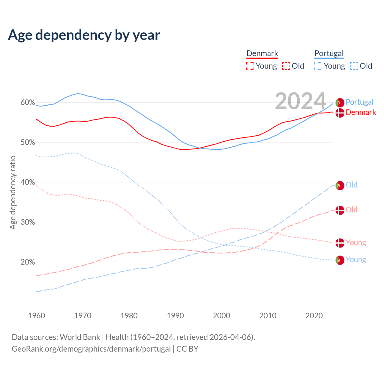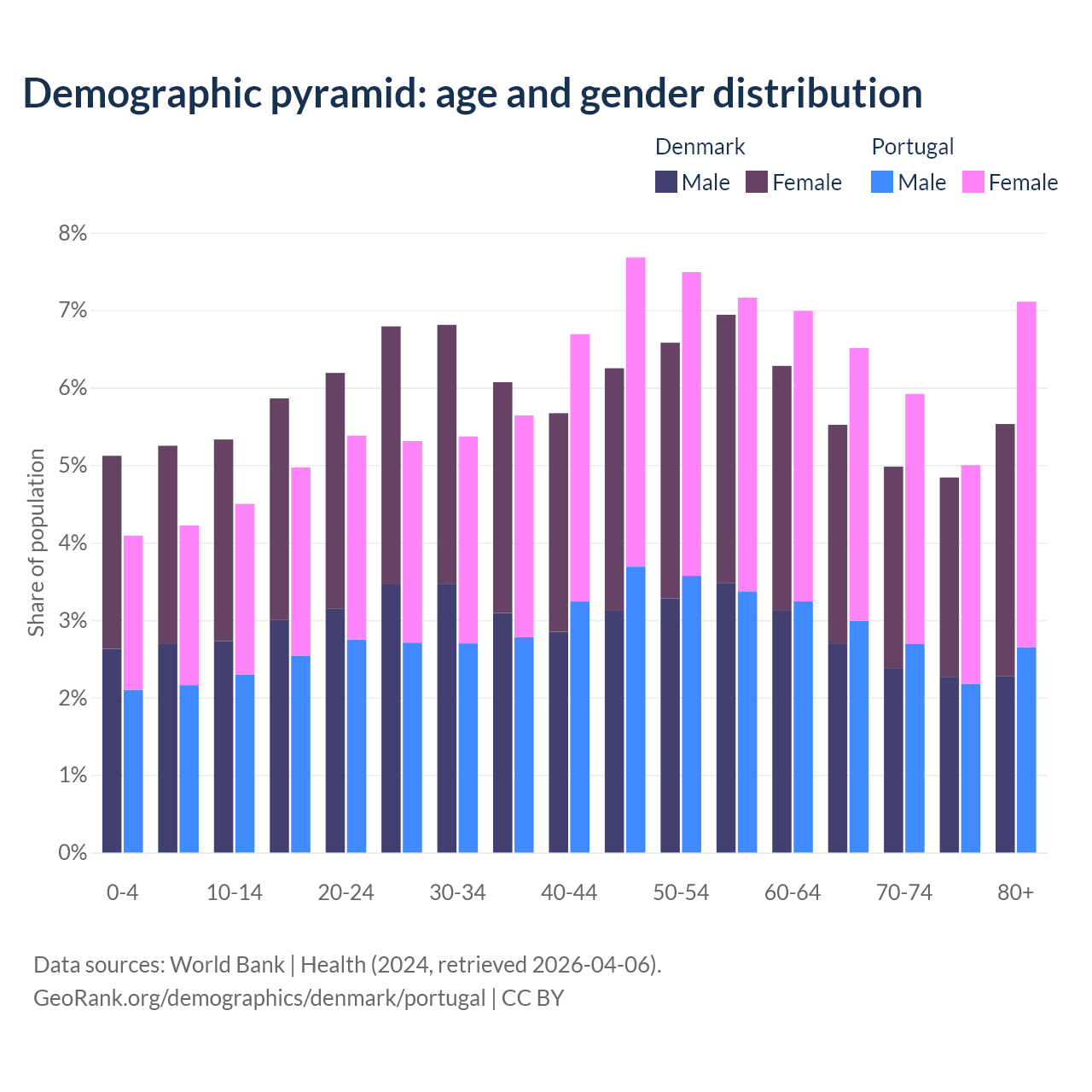 - Denmark is ranked 34/196 by median age (oldest to youngest) vs 5/196 for Portugal.