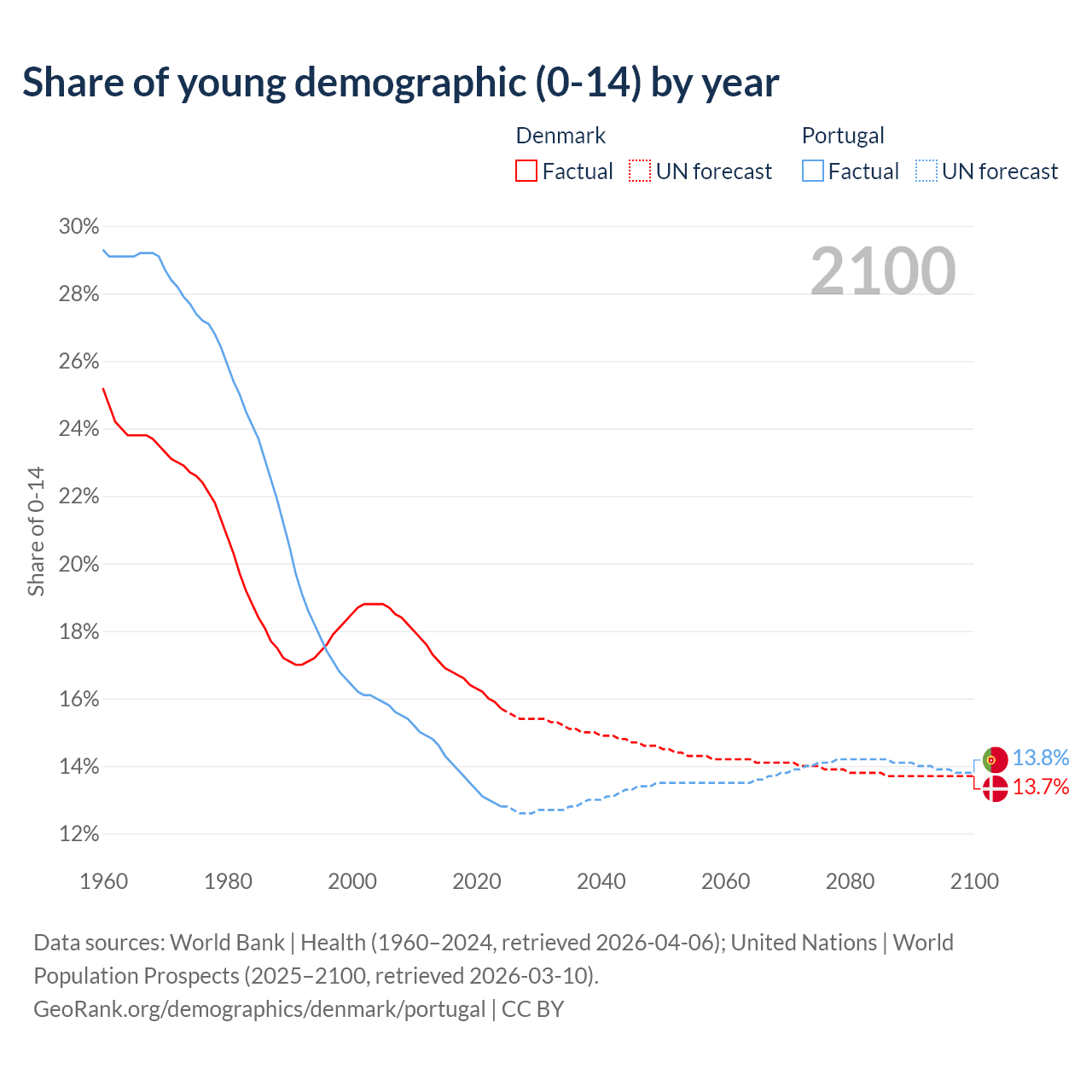 - The share of young demographic (0-15 years old) in Denmark is 15.7% vs 12.8% in Portugal.