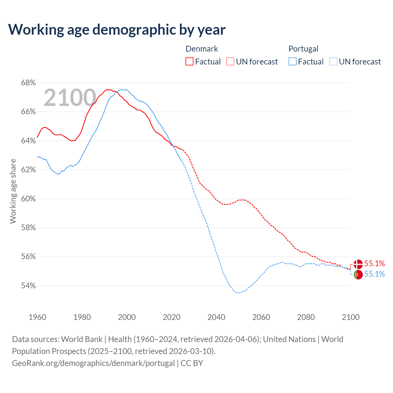 - Denmark has 3.83M working age adults (aged 15-64) vs 6.68M in Portugal.