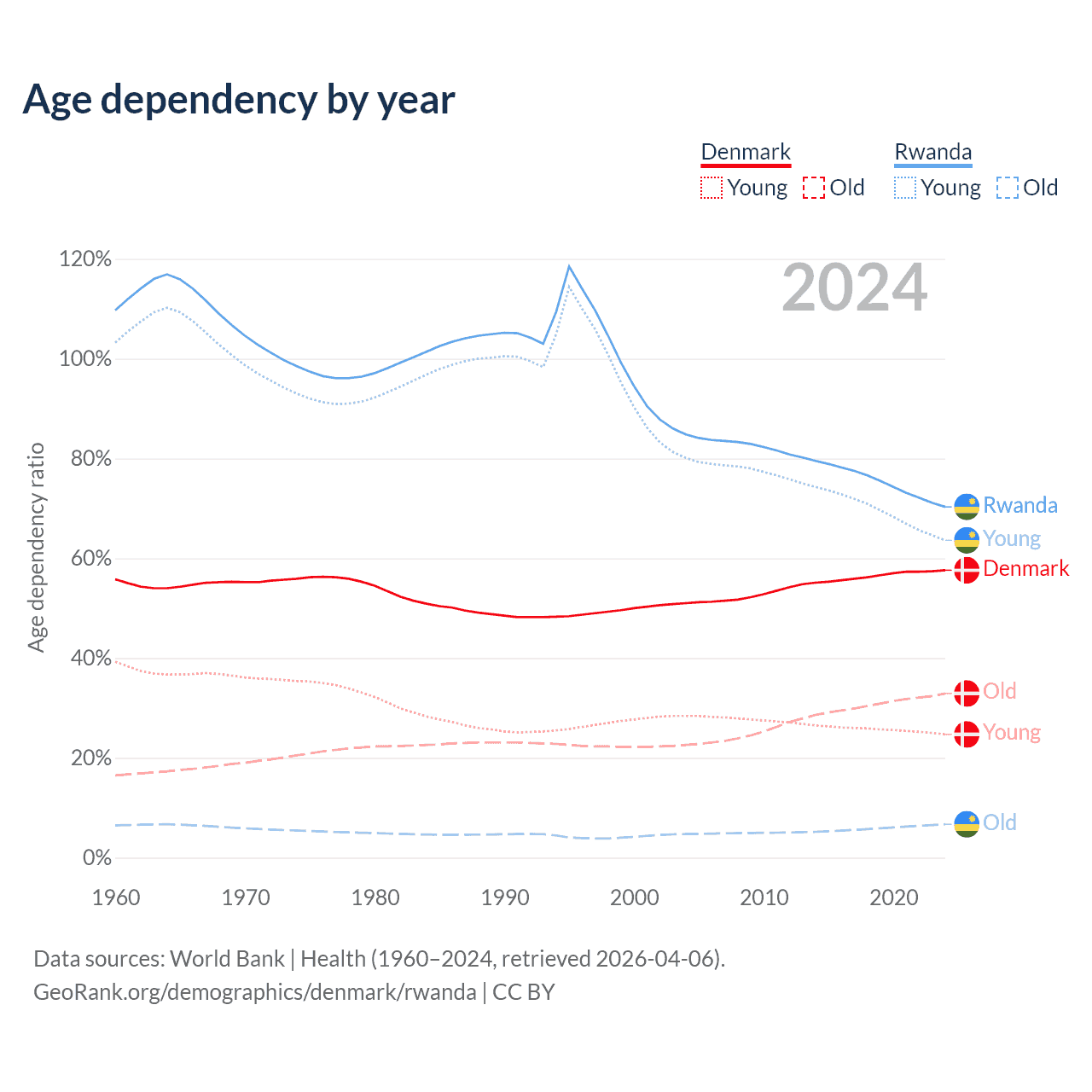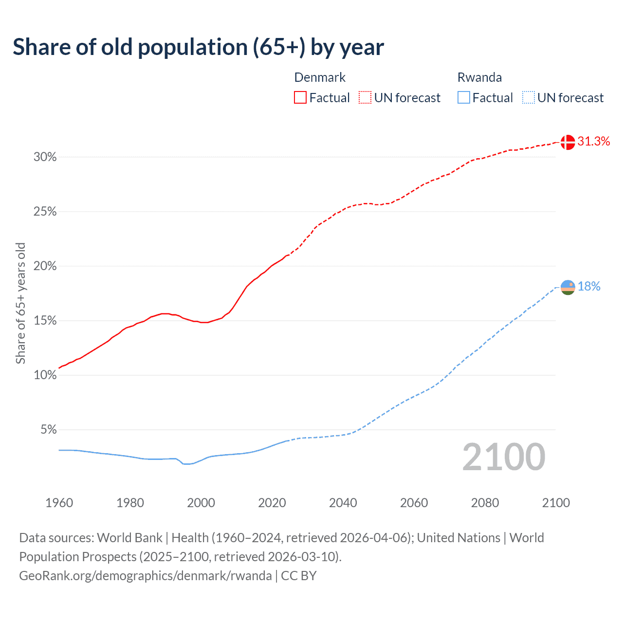 - The share of old-age demographic (65+) in Denmark is 20.9% vs 3.93% in Rwanda.