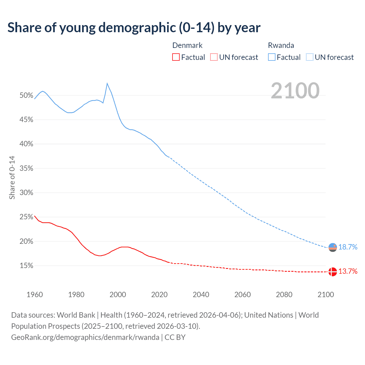 - The share of young demographic (0-15 years old) in Denmark is 15.7% vs 37.4% in Rwanda.