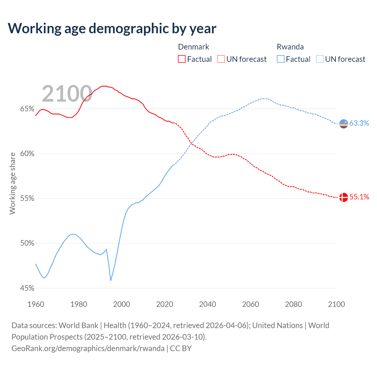 - Denmark has 3.83M working age adults (aged 15-64) vs 8.79M in Rwanda.