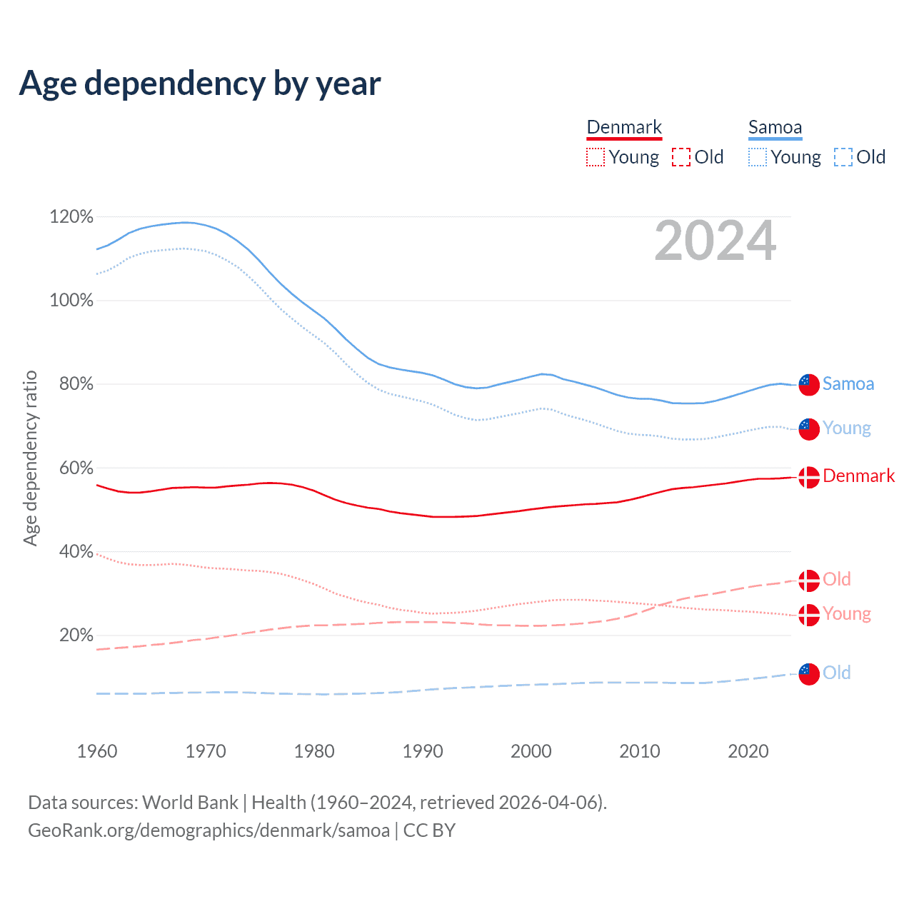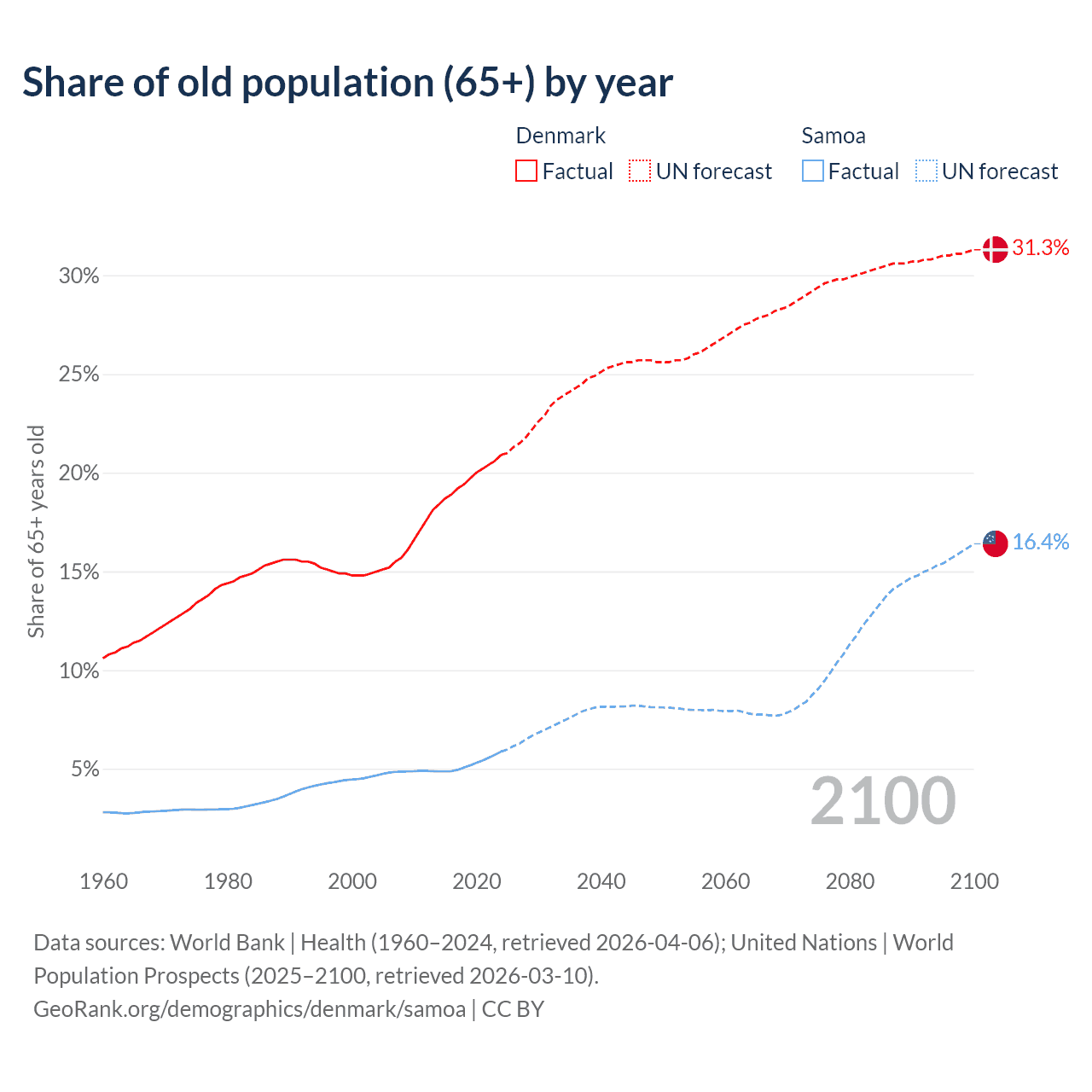 - The share of old-age demographic (65+) in Denmark is 20.9% vs 5.88% in Samoa.