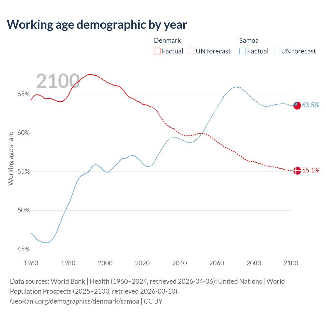 - Denmark has 3.83M working age adults (aged 15-64) vs 123K in Samoa.