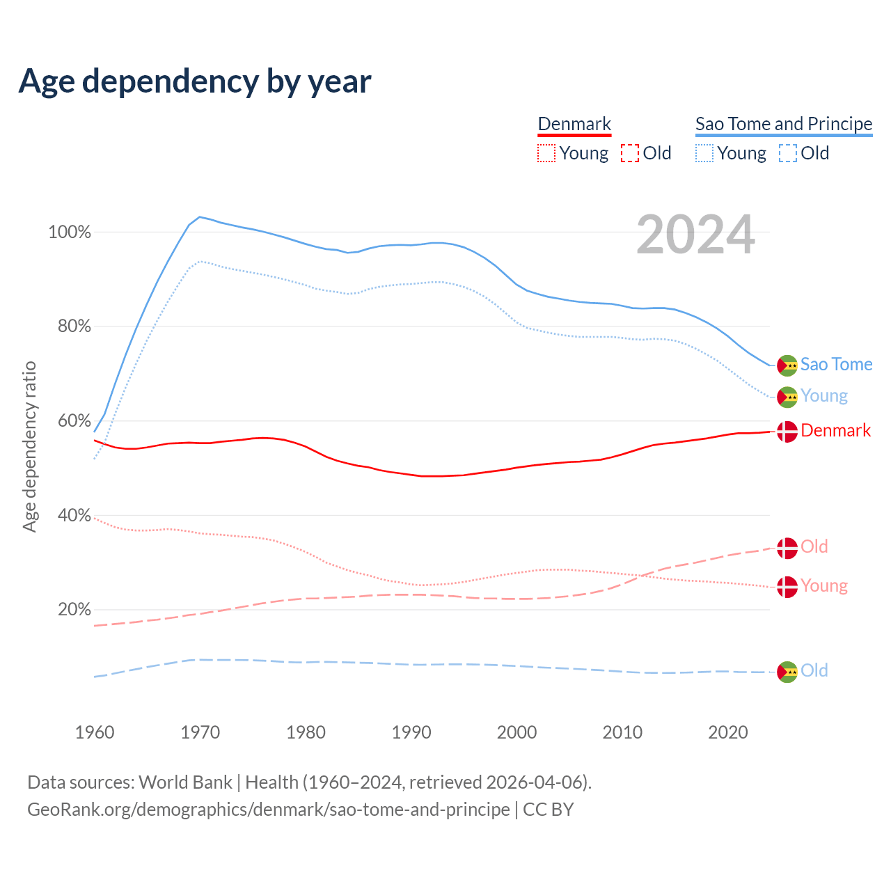 - Denmark is ranked 34/196 by median age (oldest to youngest) vs 163/196 for Sao Tome and Principe.