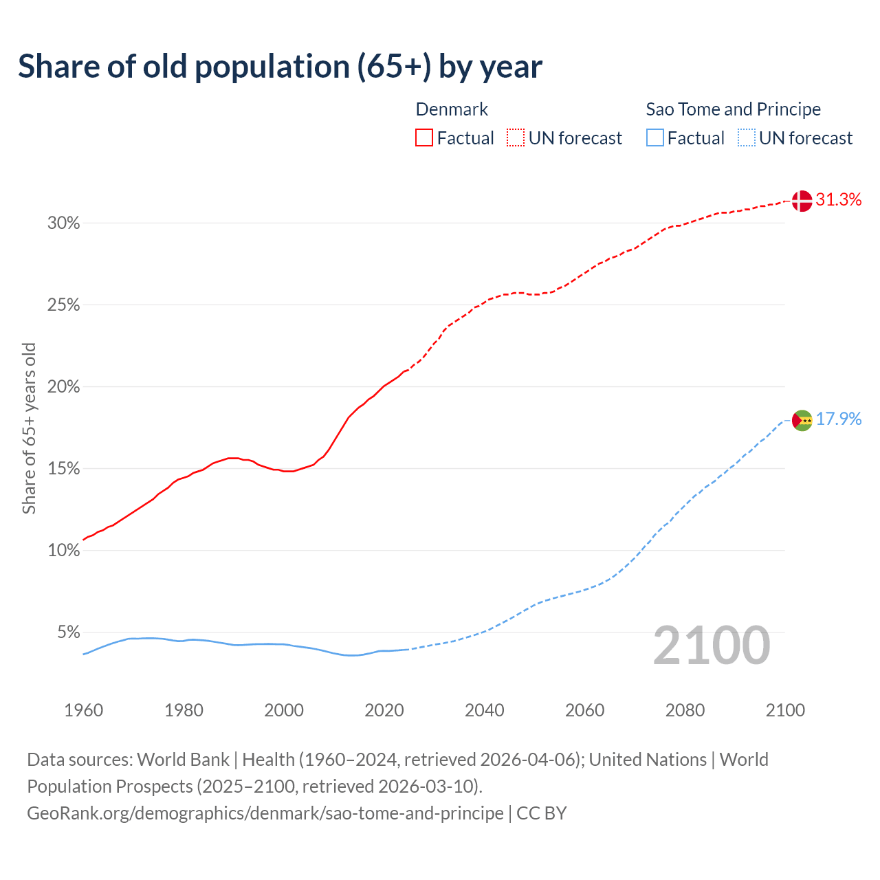 The share of older people aged 65 and over is 20.9% in Denmark and 3.9% in Sao Tome and Principe. Life expectancy in Denmark compared to Sao Tome and Principe .