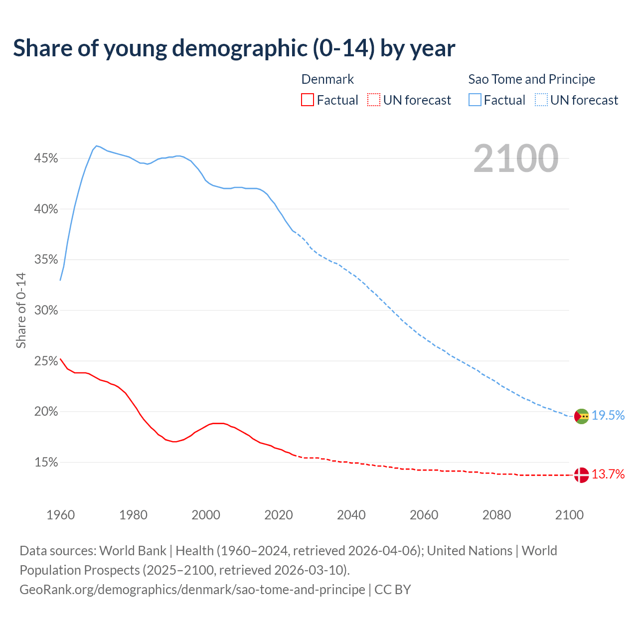 - The share of young demographic (0-15 years old) in Denmark is 15.7% vs 37.8% in Sao Tome and Principe.