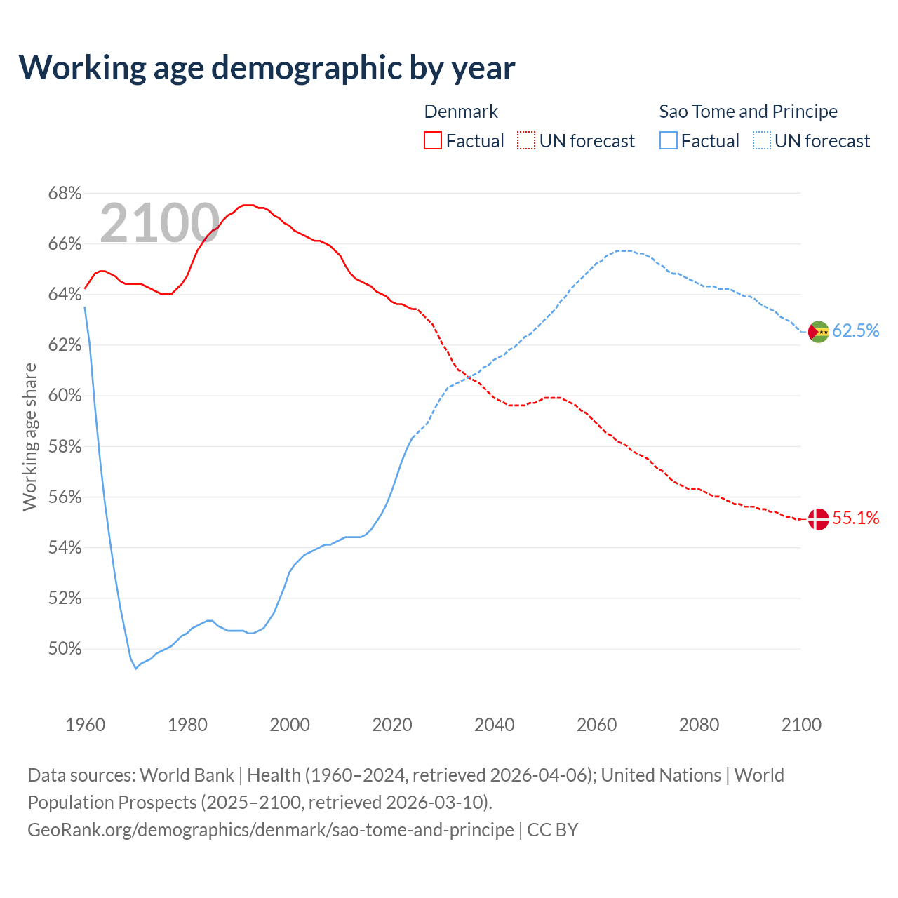 - As of 2026, the population of Denmark is 6.03M vs 246K in Sao Tome and Principe - 24.5 times difference.