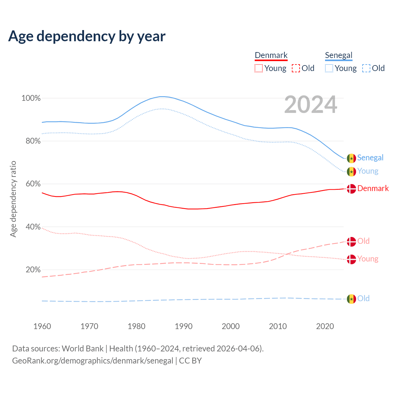 - Denmark is ranked 34/196 by median age (oldest to youngest) vs 162/196 for Senegal.