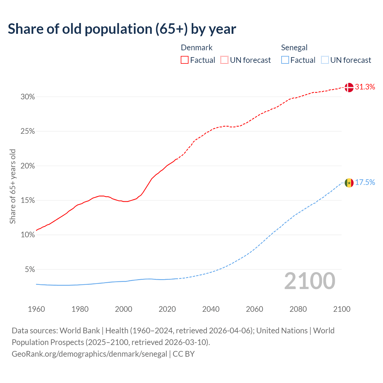 - The share of old-age demographic (65+) in Denmark is 20.9% vs 3.62% in Senegal.