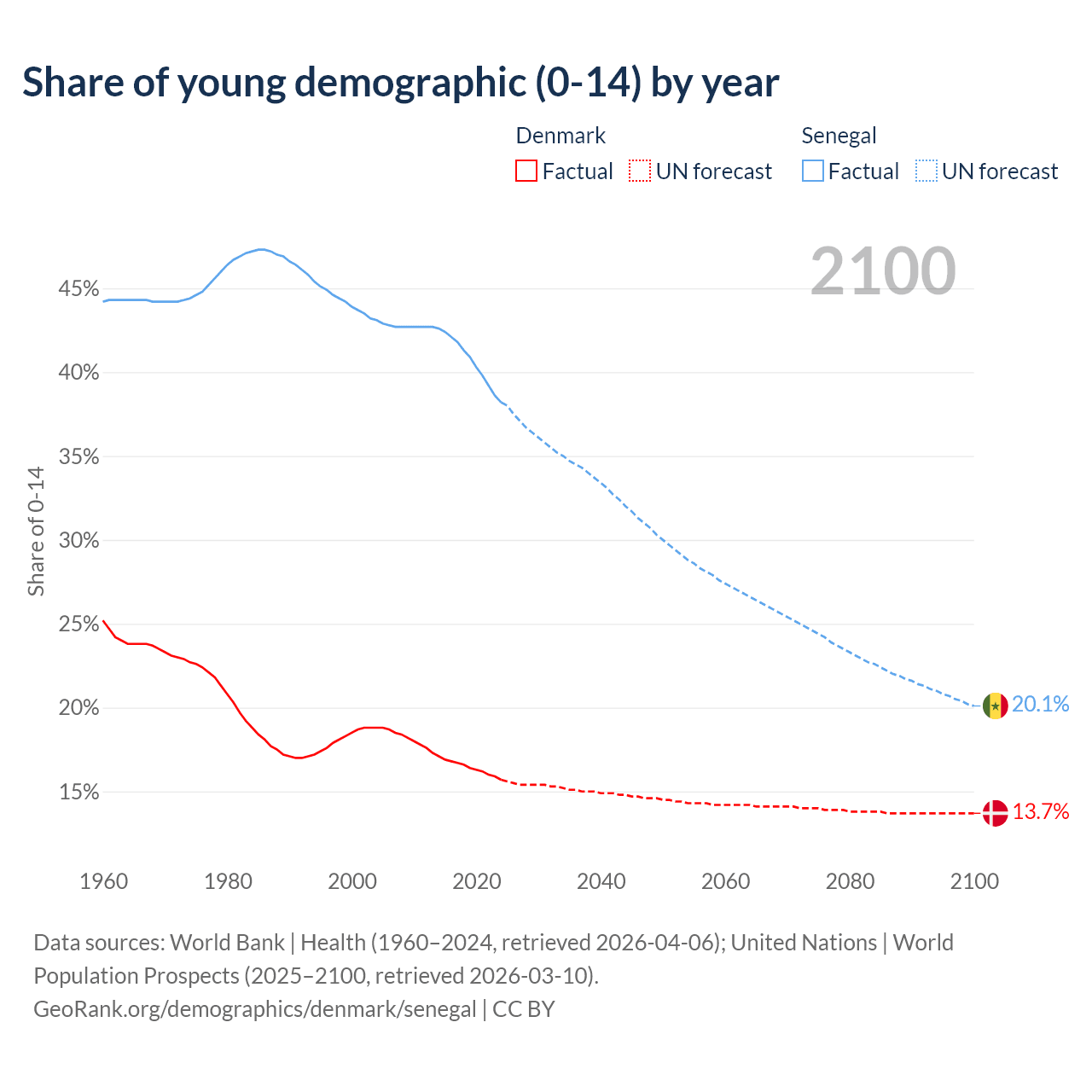 - The share of young demographic (0-15 years old) in Denmark is 15.7% vs 38.2% in Senegal.