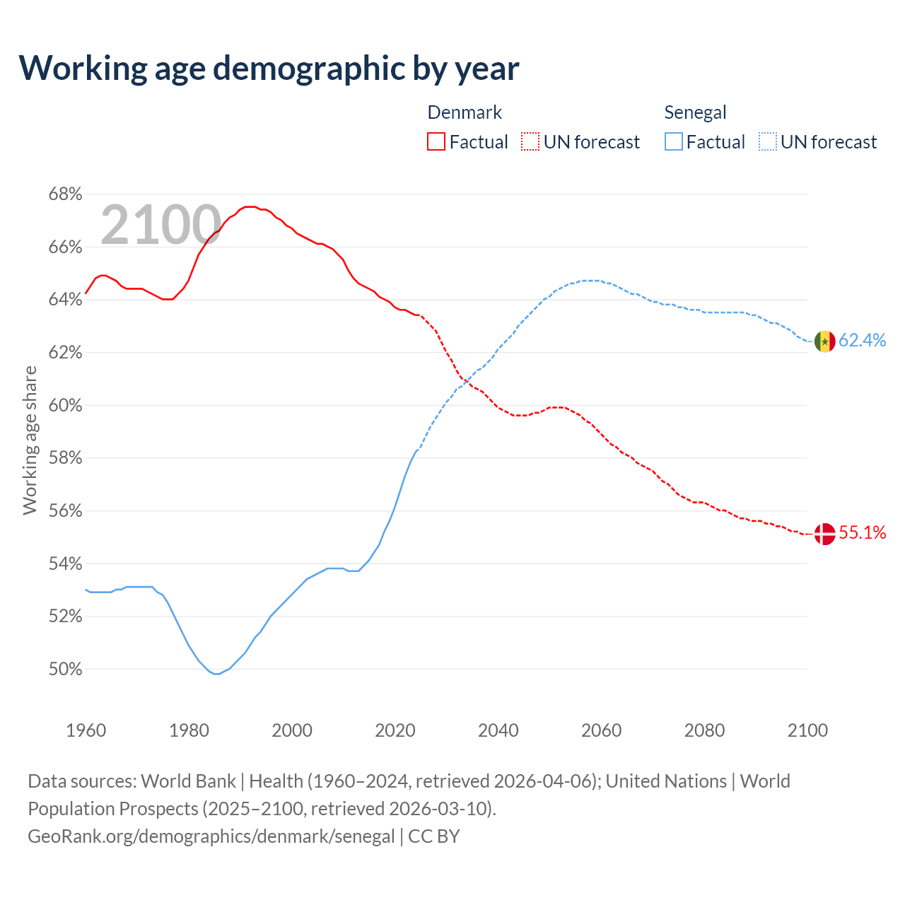 - Denmark has 3.83M working age adults (aged 15-64) vs 11.3M in Senegal.