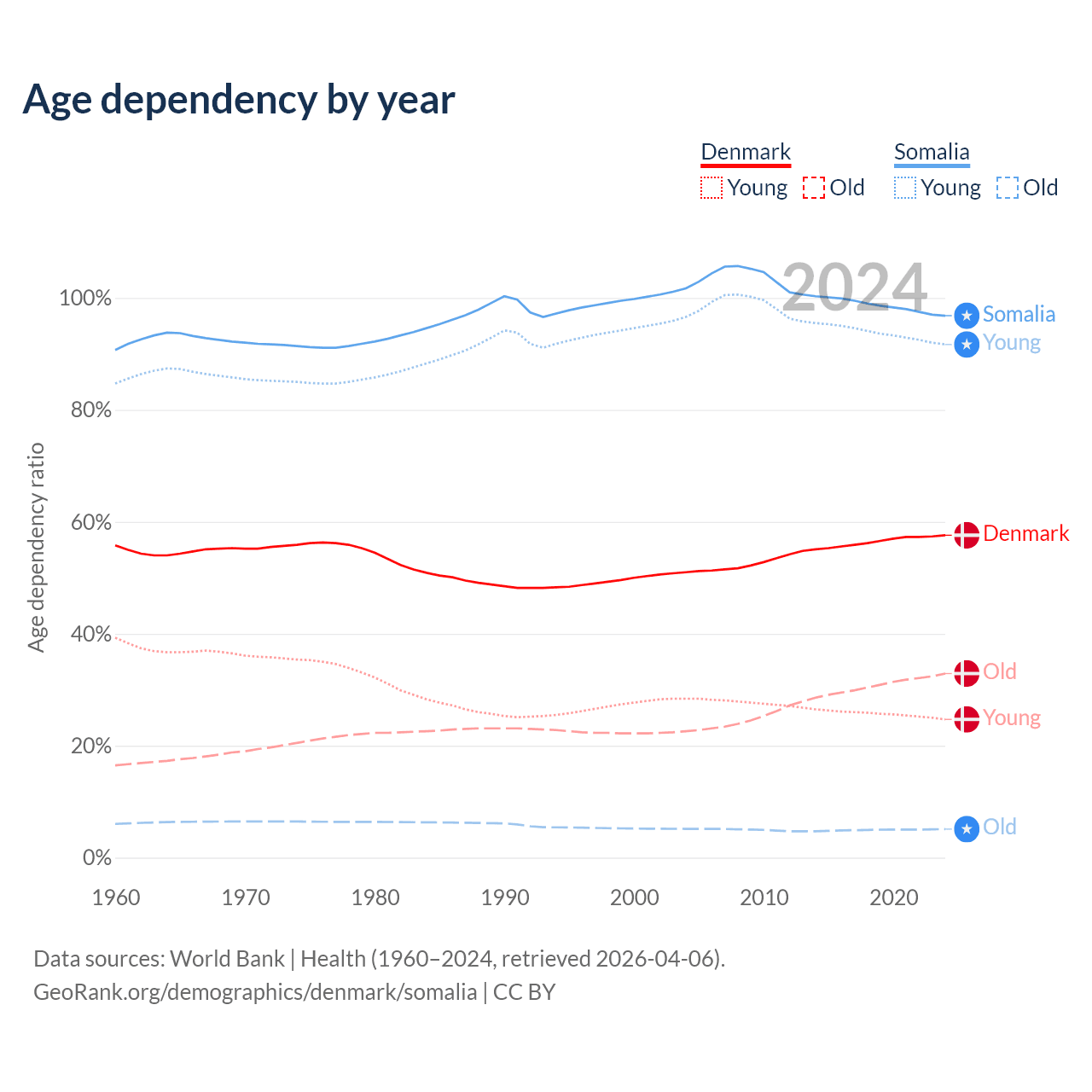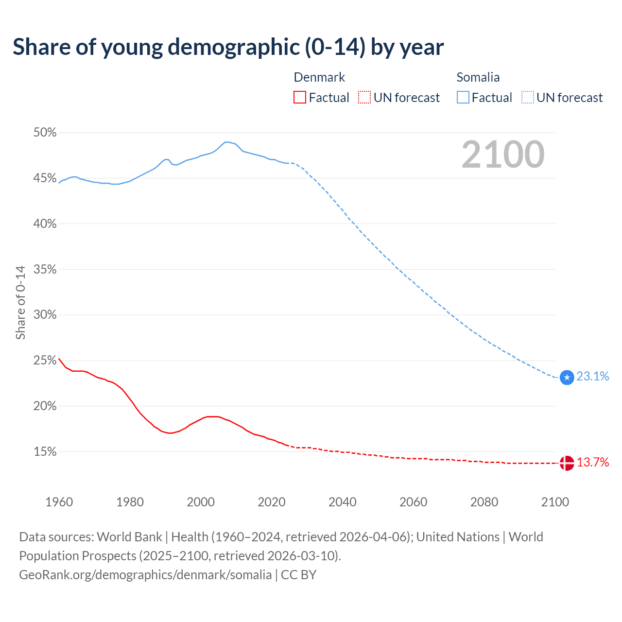 - The share of young demographic (0-15 years old) in Denmark is 15.7% vs 46.6% in Somalia.