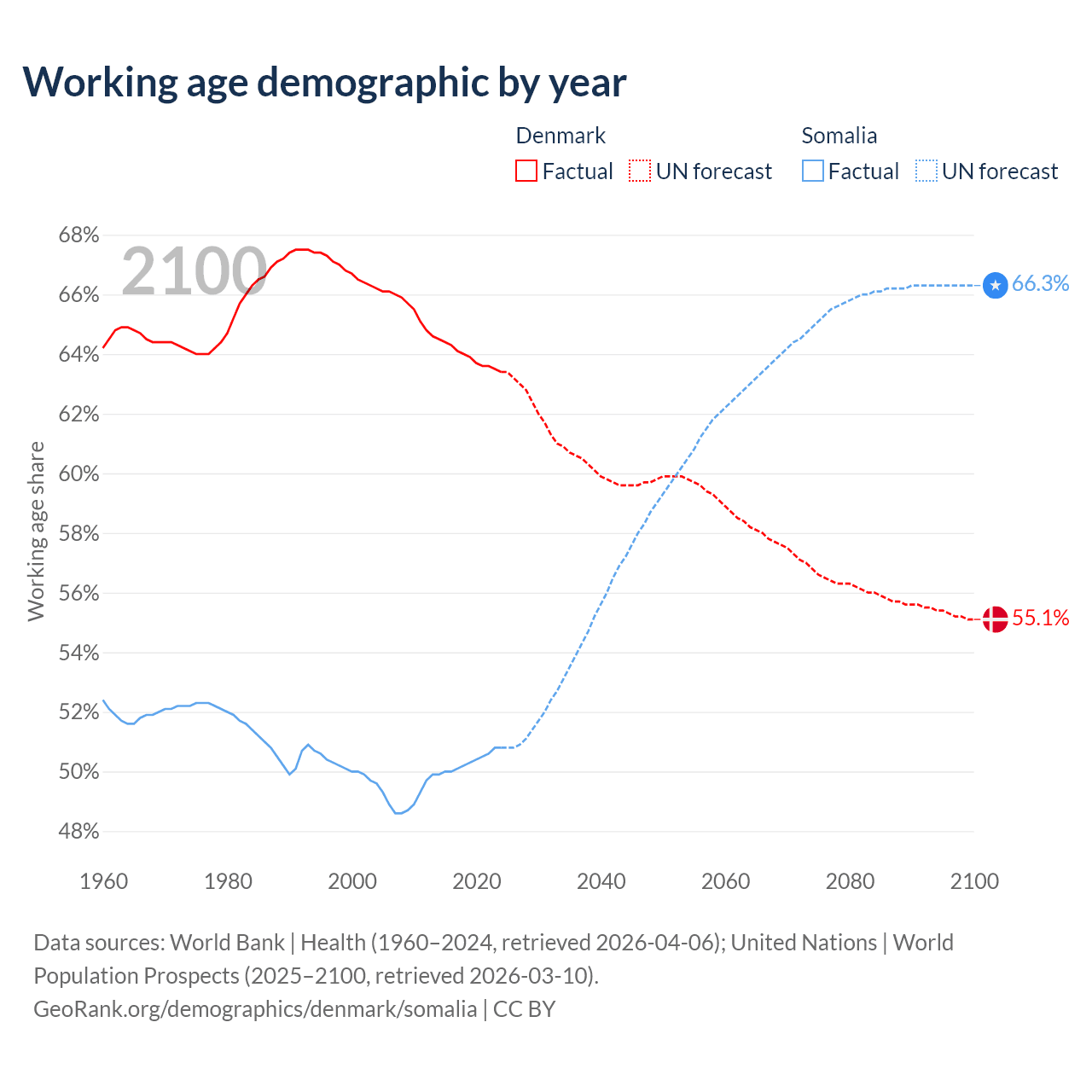 - Denmark has 3.83M working age adults (aged 15-64) vs 10.4M in Somalia.