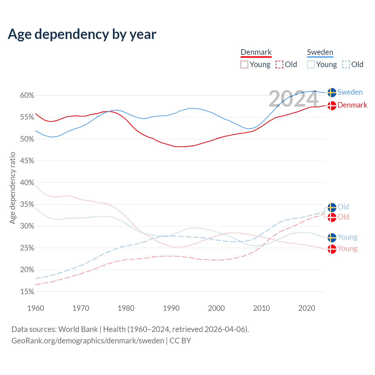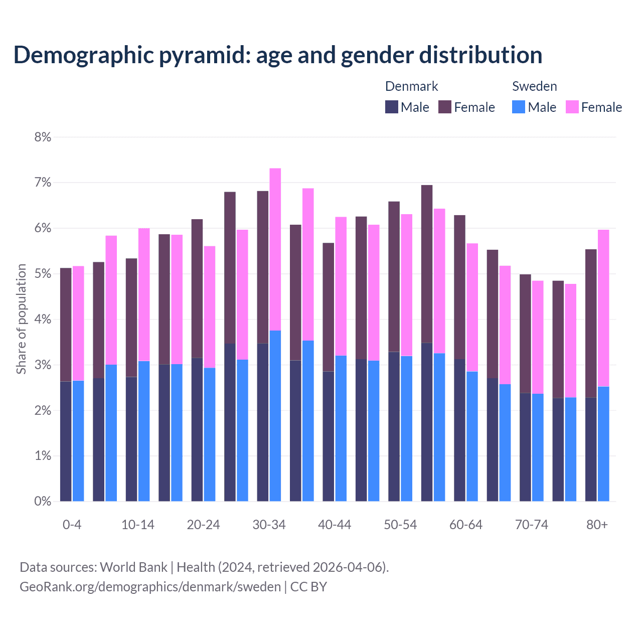 - Denmark is ranked 34/196 by median age (oldest to youngest) vs 39/196 for Sweden.