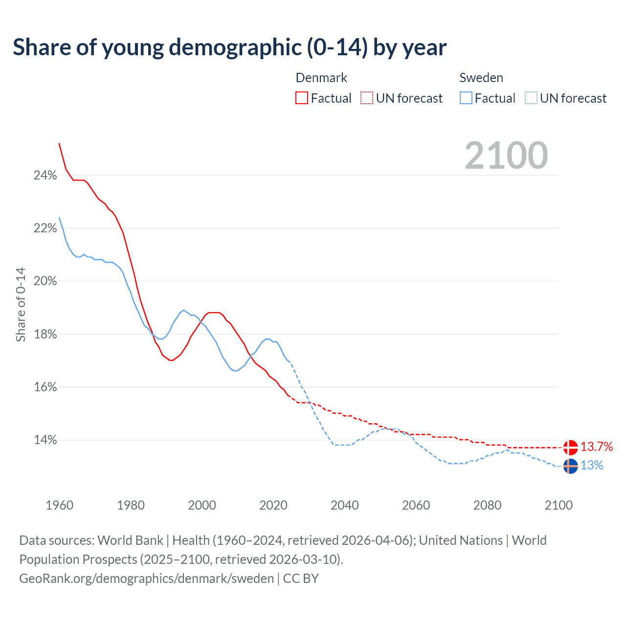 - The share of young demographic (0-15 years old) in Denmark is 15.7% vs 17% in Sweden.