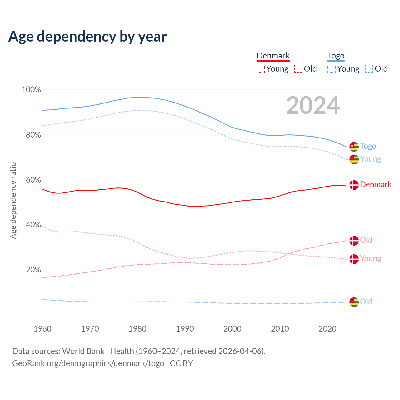 The share of older people aged 65 and over is 20.9% in Denmark and 3.21% in Togo. Life expectancy in Denmark compared to Togo .