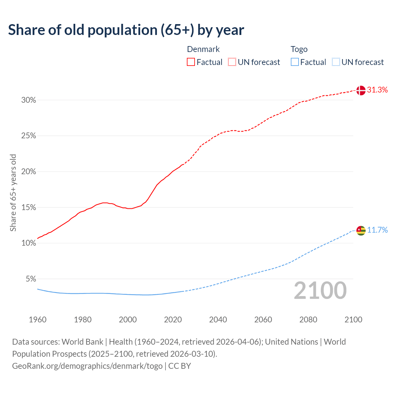 - The share of old-age demographic (65+) in Denmark is 20.9% vs 3.21% in Togo.