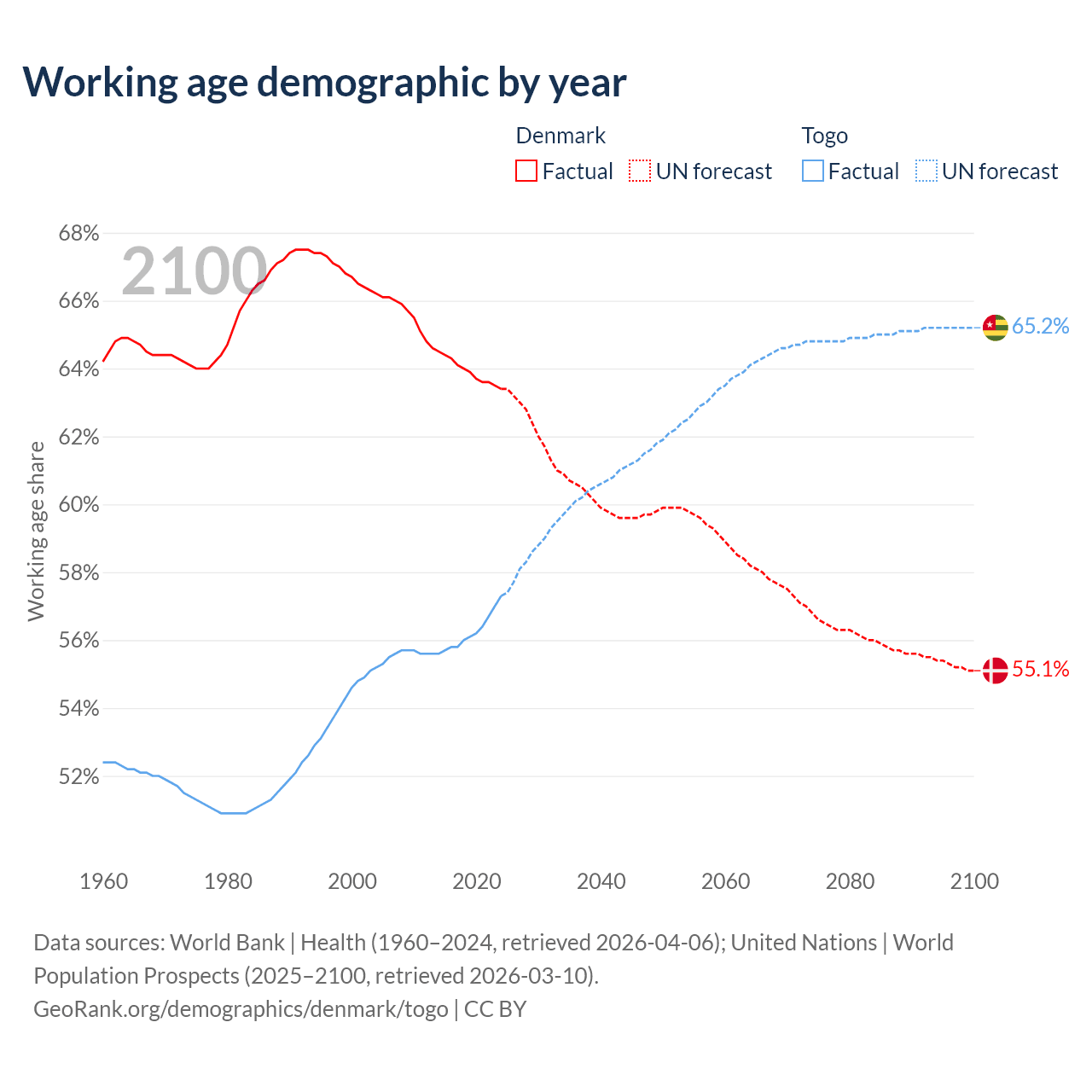 - Denmark has 3.83M working age adults (aged 15-64) vs 5.72M in Togo.