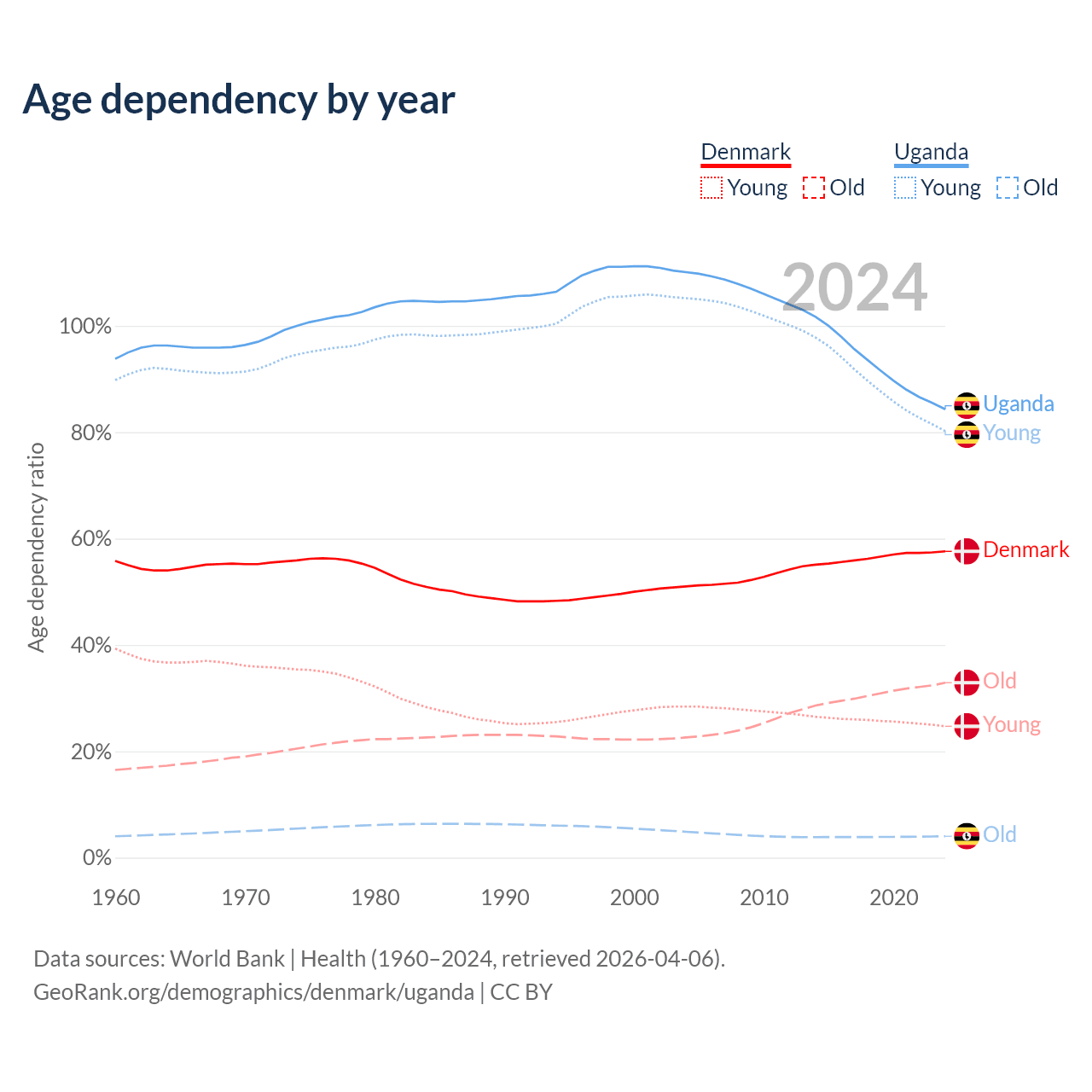 - Denmark is ranked 34/196 by median age (oldest to youngest) vs 187/196 for Uganda.