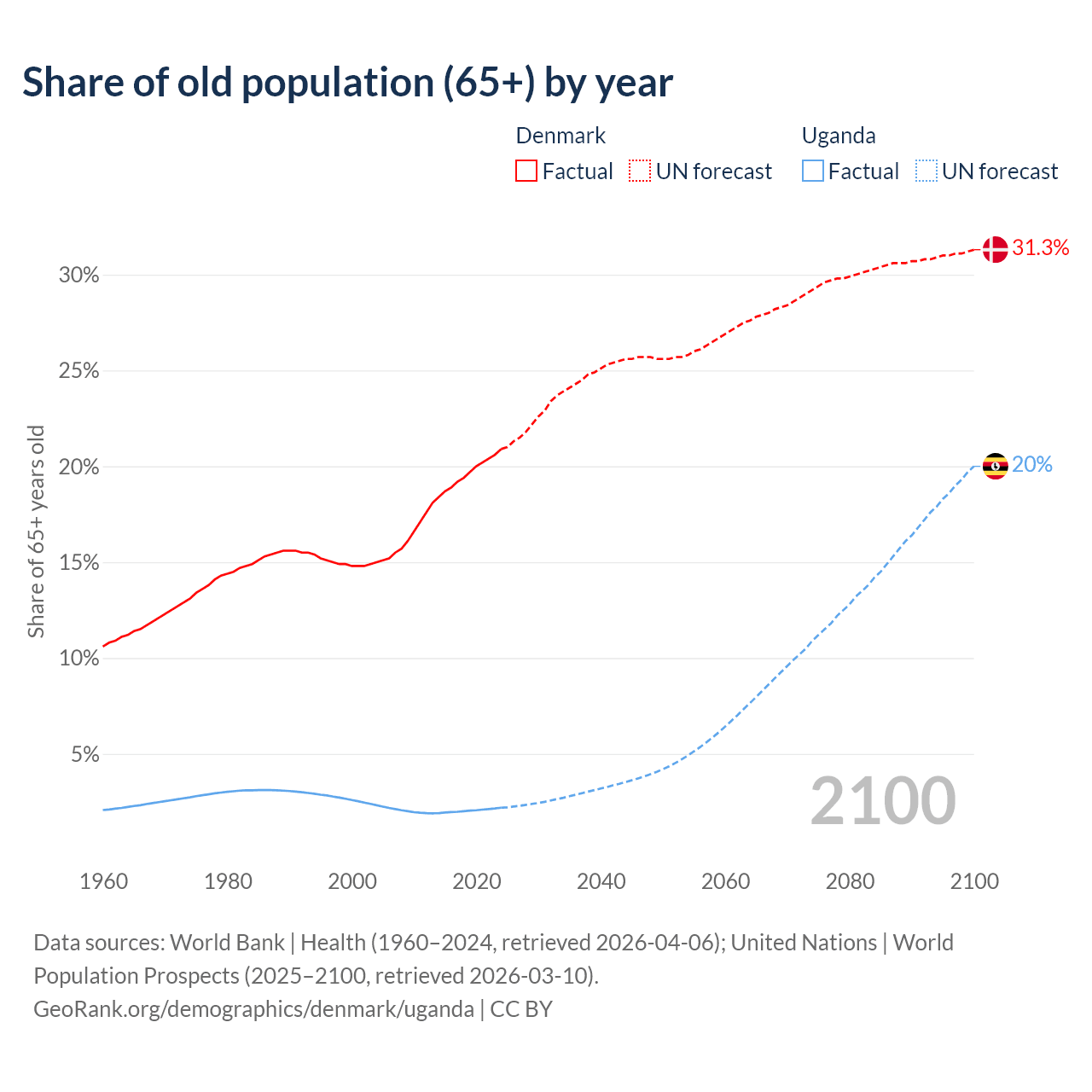 - The share of old-age demographic (65+) in Denmark is 20.9% vs 2.19% in Uganda.