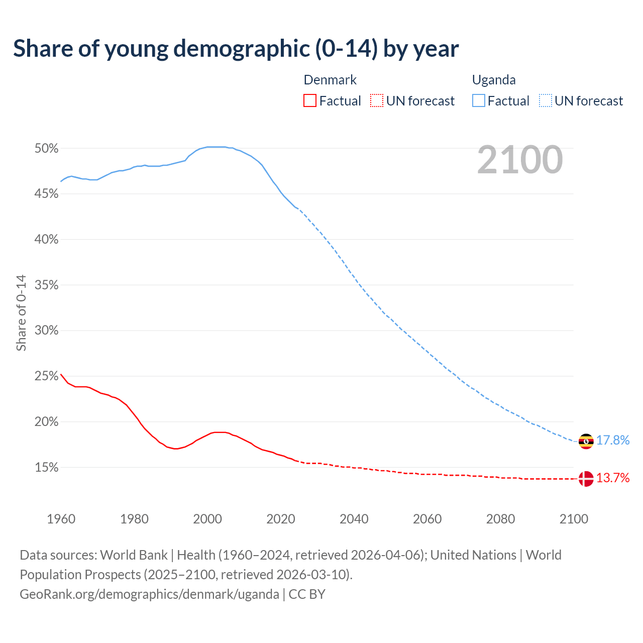 - The share of young demographic (0-15 years old) in Denmark is 15.7% vs 43.5% in Uganda.