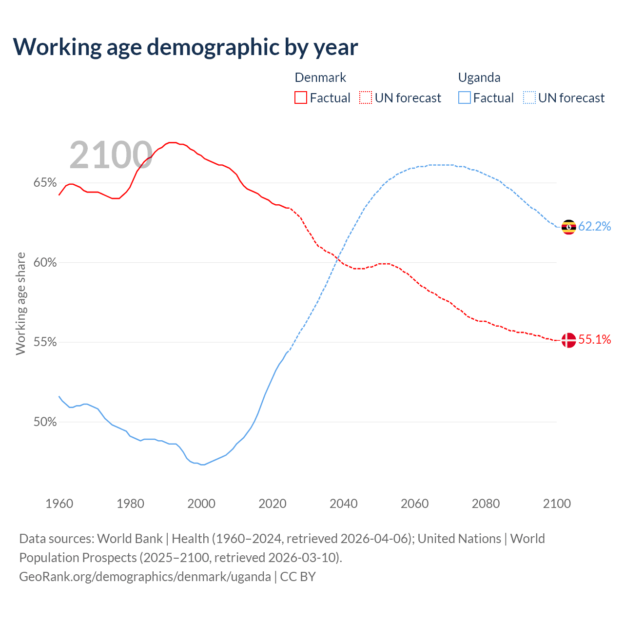 Median age Denmark vs Uganda, 1960-2100