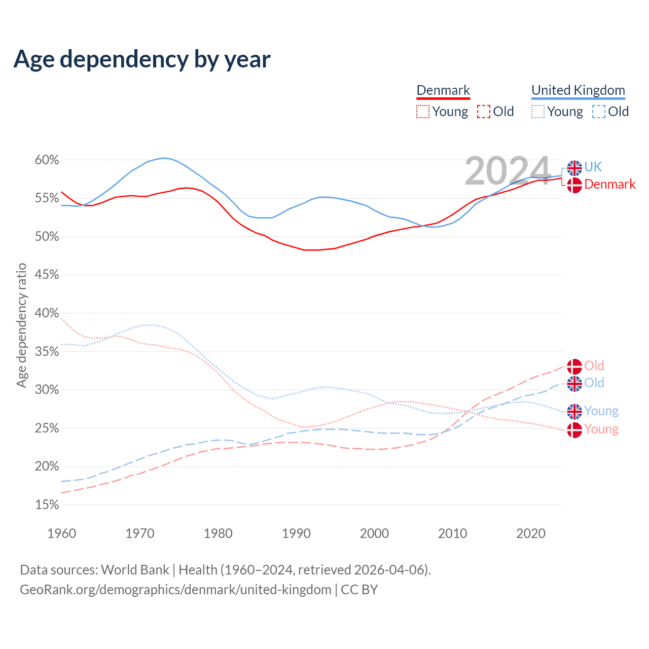 Data sources: World Bank | Health (1960–2024, retrieved 2026-04-06); U.S. Census Bureau (1960–2024, retrieved 2026-02-08).
