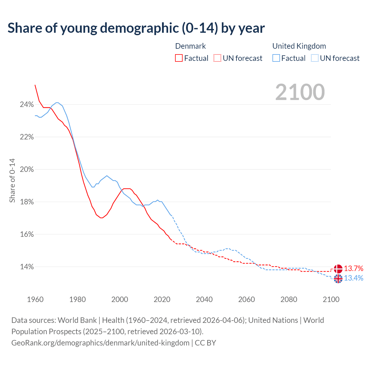 - The share of young demographic (0-15 years old) in Denmark is 15.7% vs 17.2% in the United Kingdom.