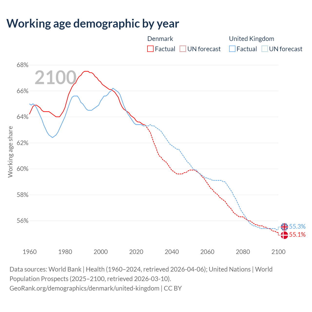 Median age Denmark vs United Kingdom, 1960-2100