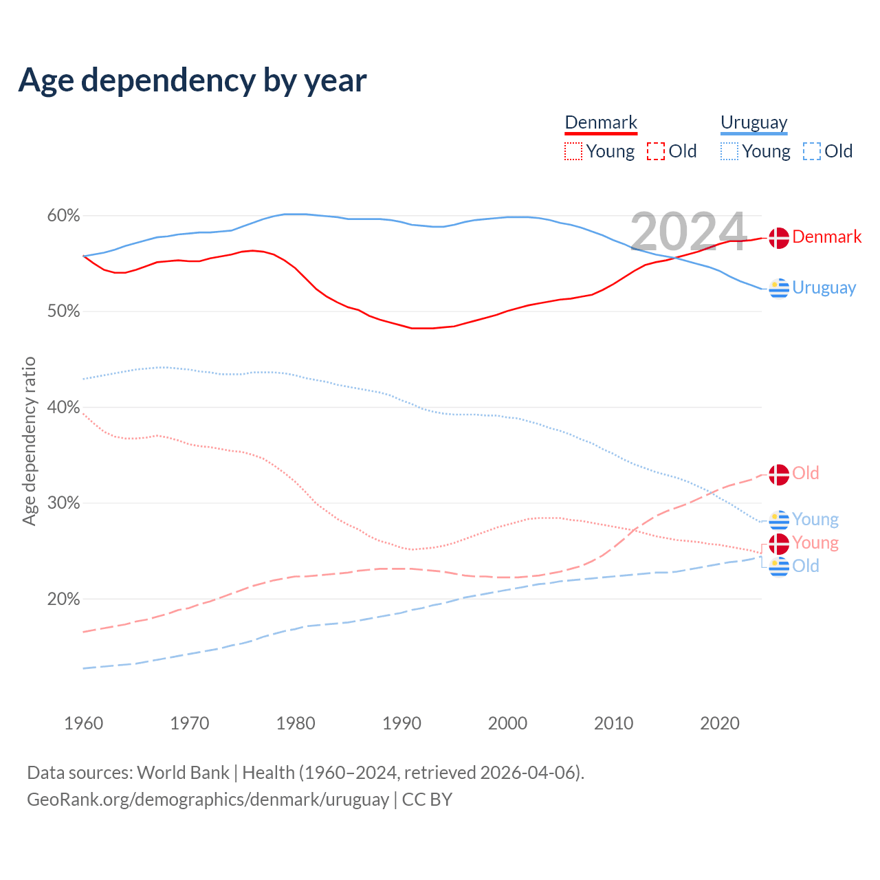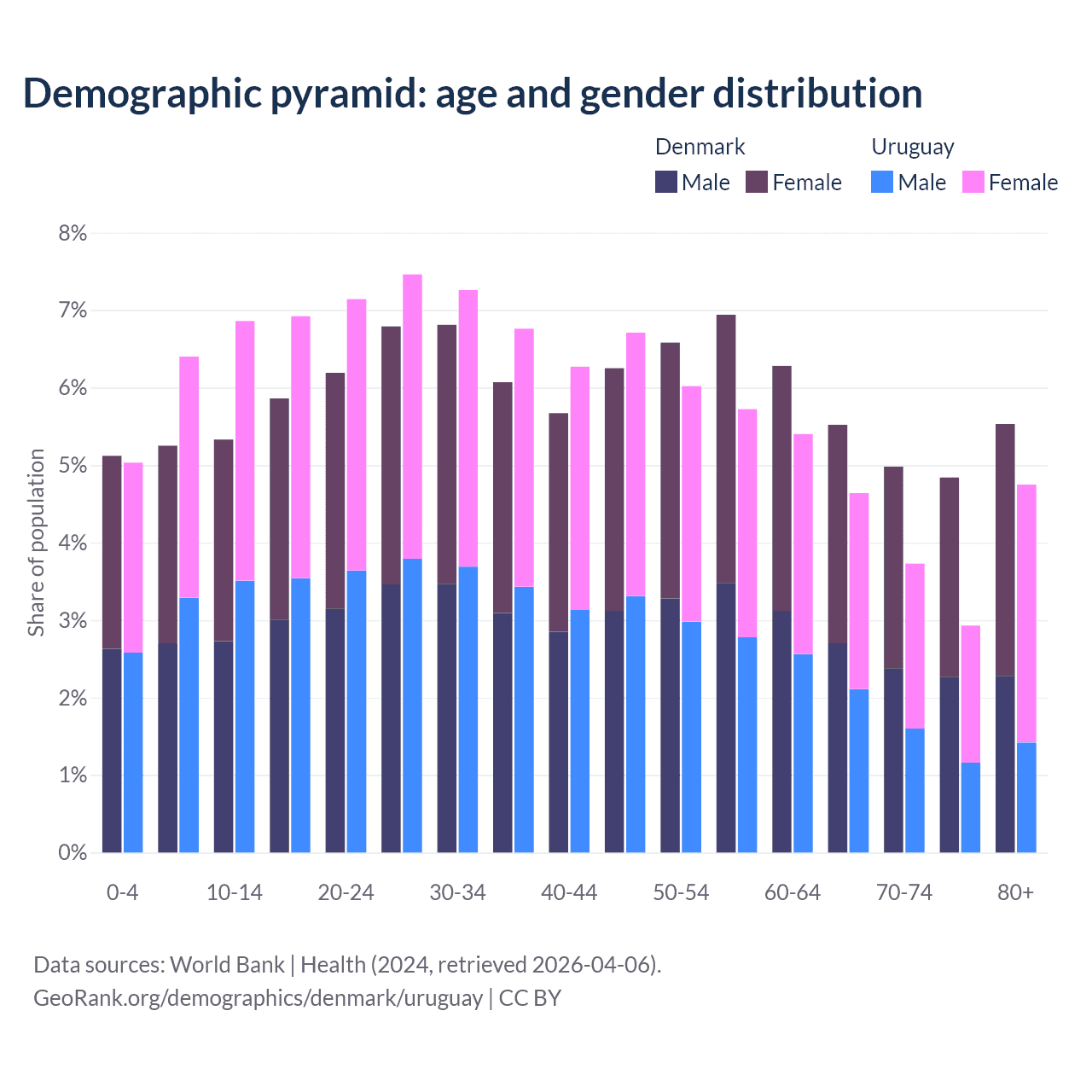- Denmark is ranked 34/196 by median age (oldest to youngest) vs 63/196 for Uruguay.