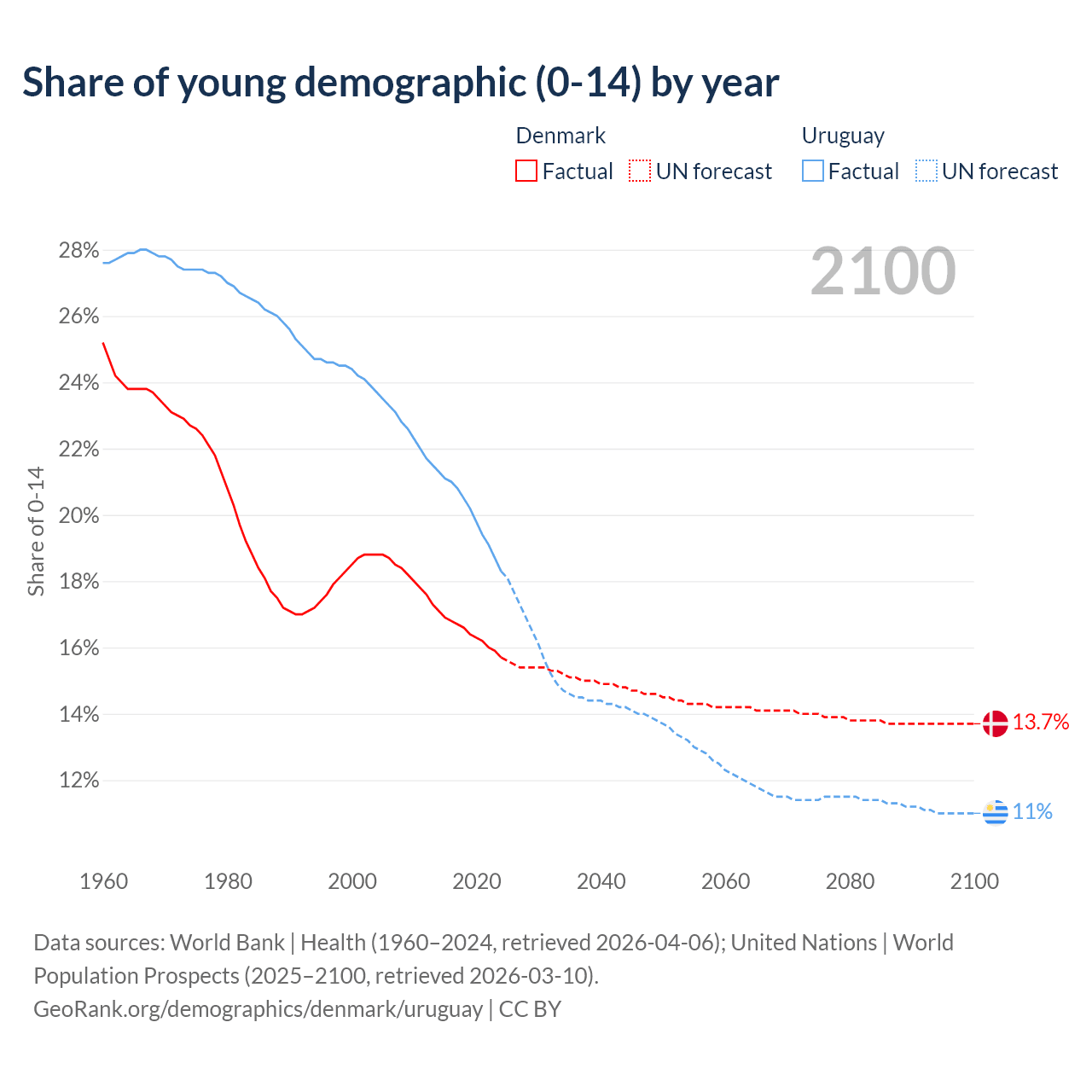 - The share of young demographic (0-15 years old) in Denmark is 15.7% vs 18.3% in Uruguay.