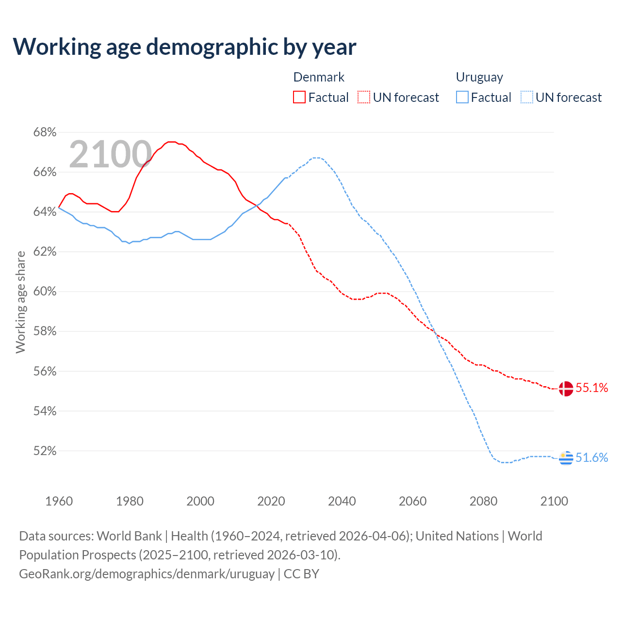 - Denmark has 3.83M working age adults (aged 15-64) vs 2.22M in Uruguay.