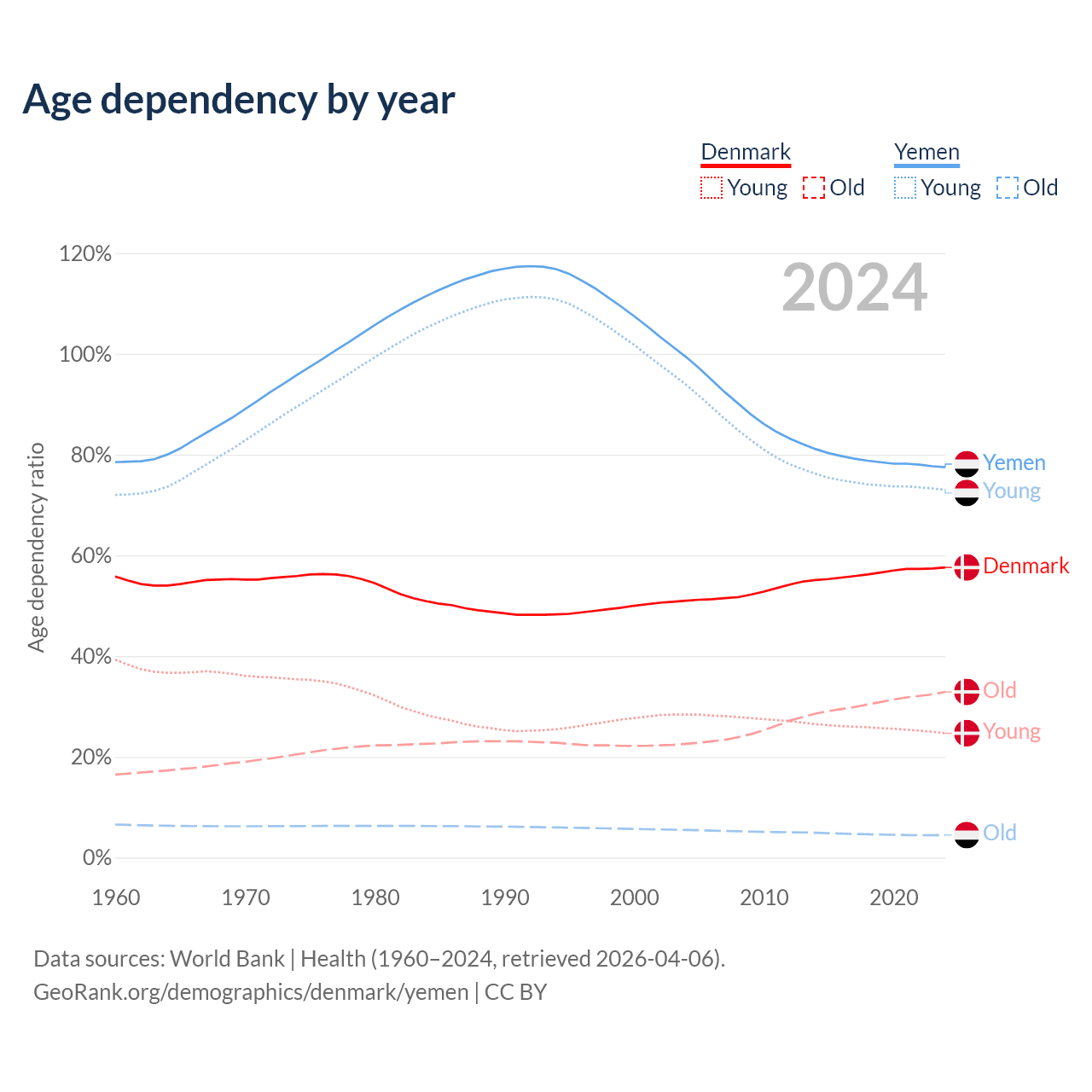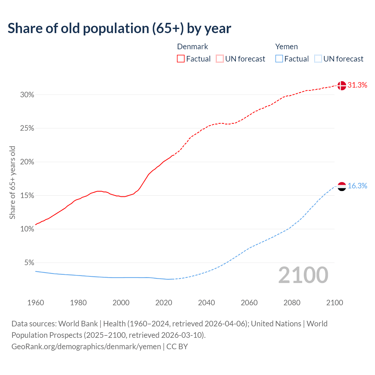 The share of older people aged 65 and over is 20.9% in Denmark and 2.52% in Yemen. Life expectancy in Denmark compared to Yemen .