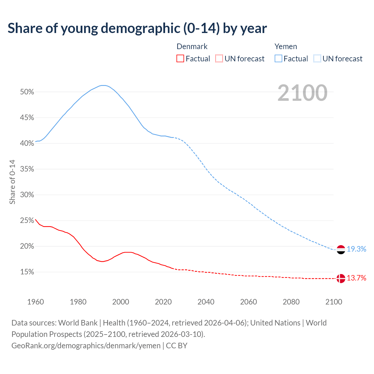 - The share of young demographic (0-15 years old) in Denmark is 15.7% vs 41.1% in Yemen.
