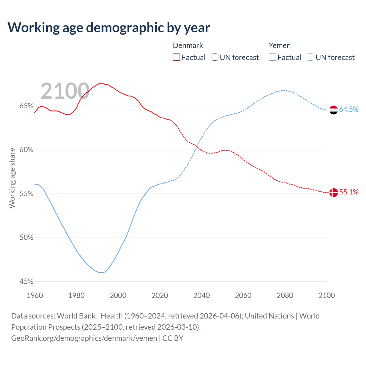 - Denmark has 3.83M working age adults (aged 15-64) vs 24.4M in Yemen.
