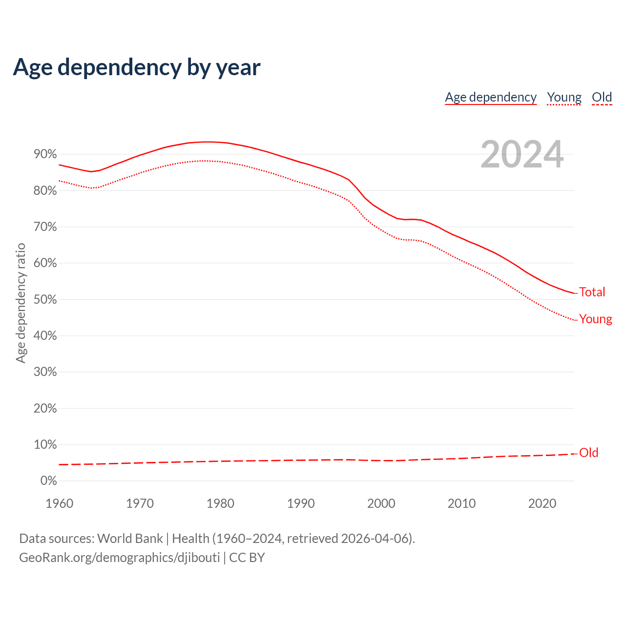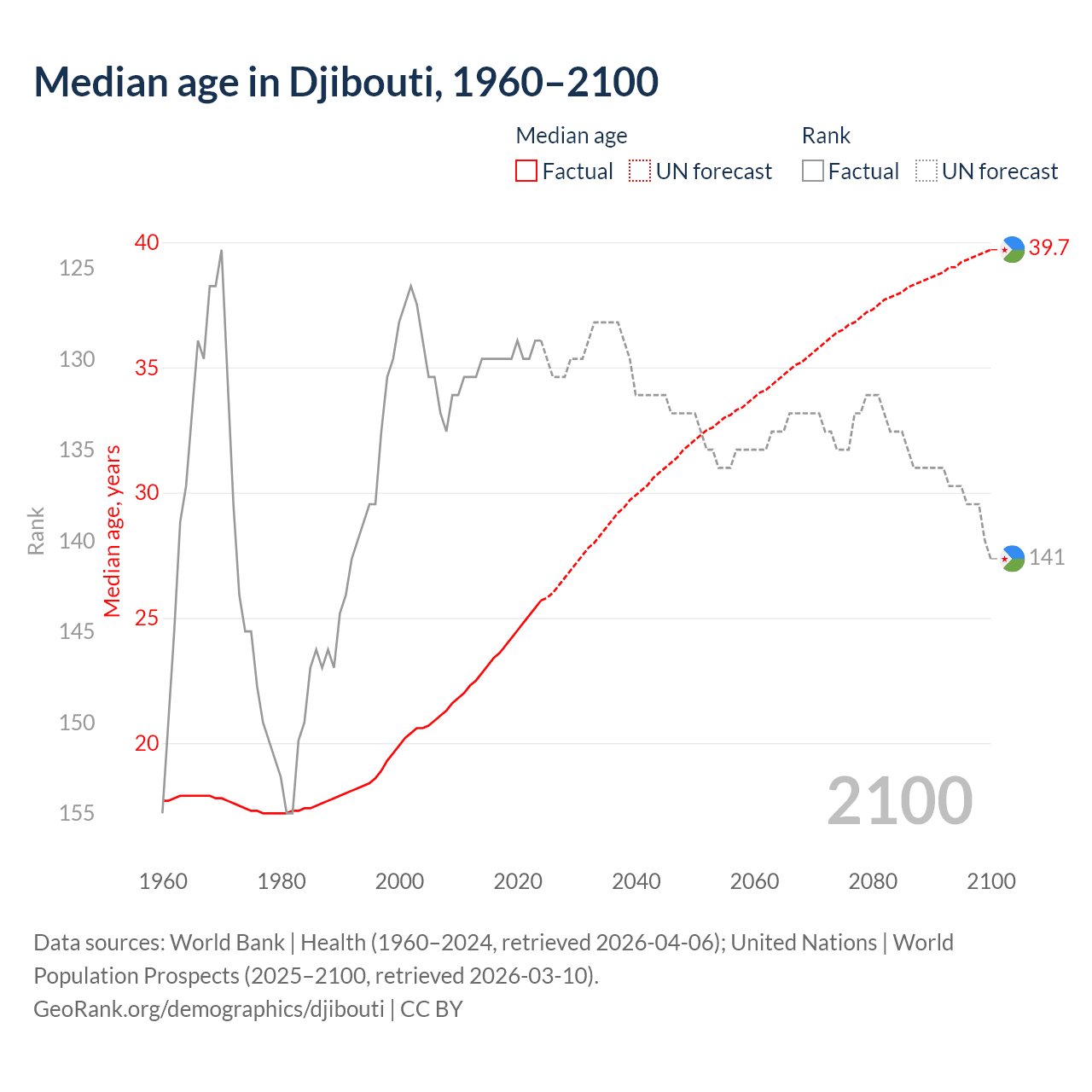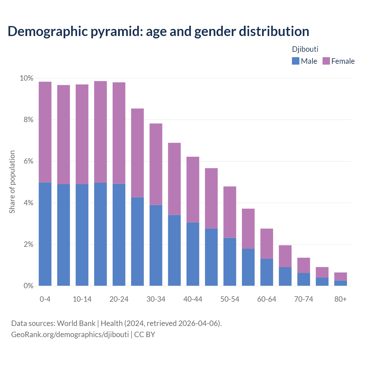 With a population of 1.17M people, Djibouti has a median age of 25.7 years which makes it the 129/196 oldest country. 29.2% of the demographic are children 0-14 years old, 66% are working-age people aged 15-64, and 4.85% are older population aged 65+ years.