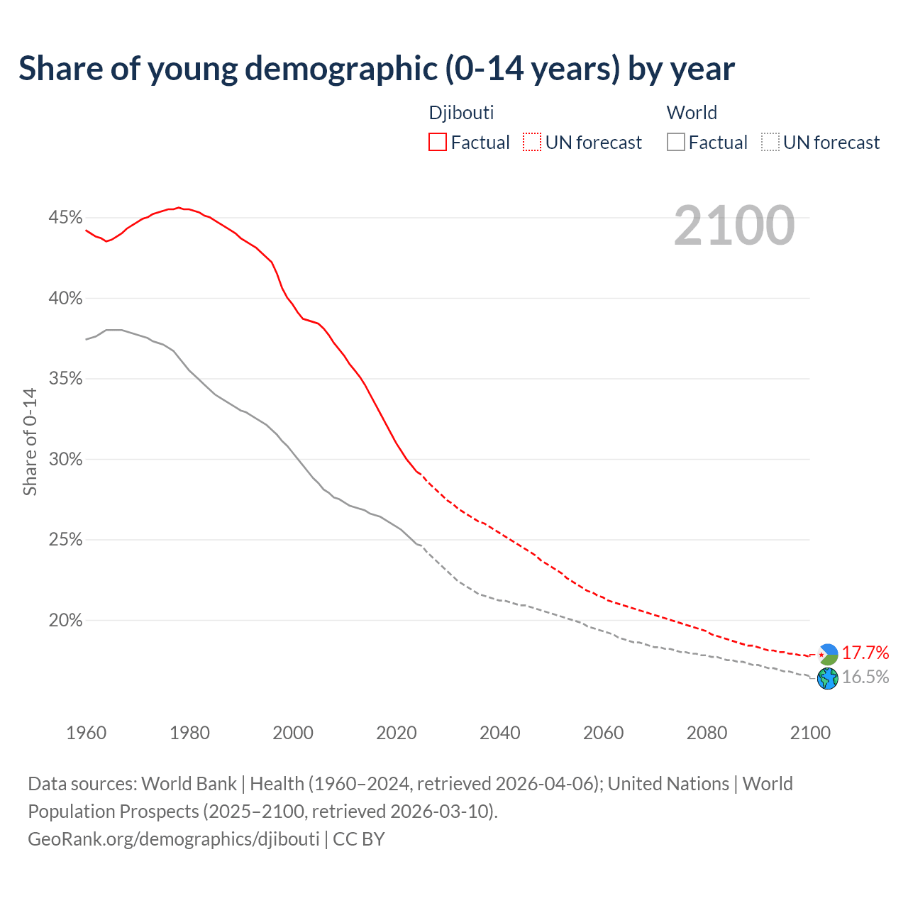The share of children aged 0-14 in Djibouti decreased from 38.5% to 29.2% between 2004 and 2024 due to changes in birth rates.