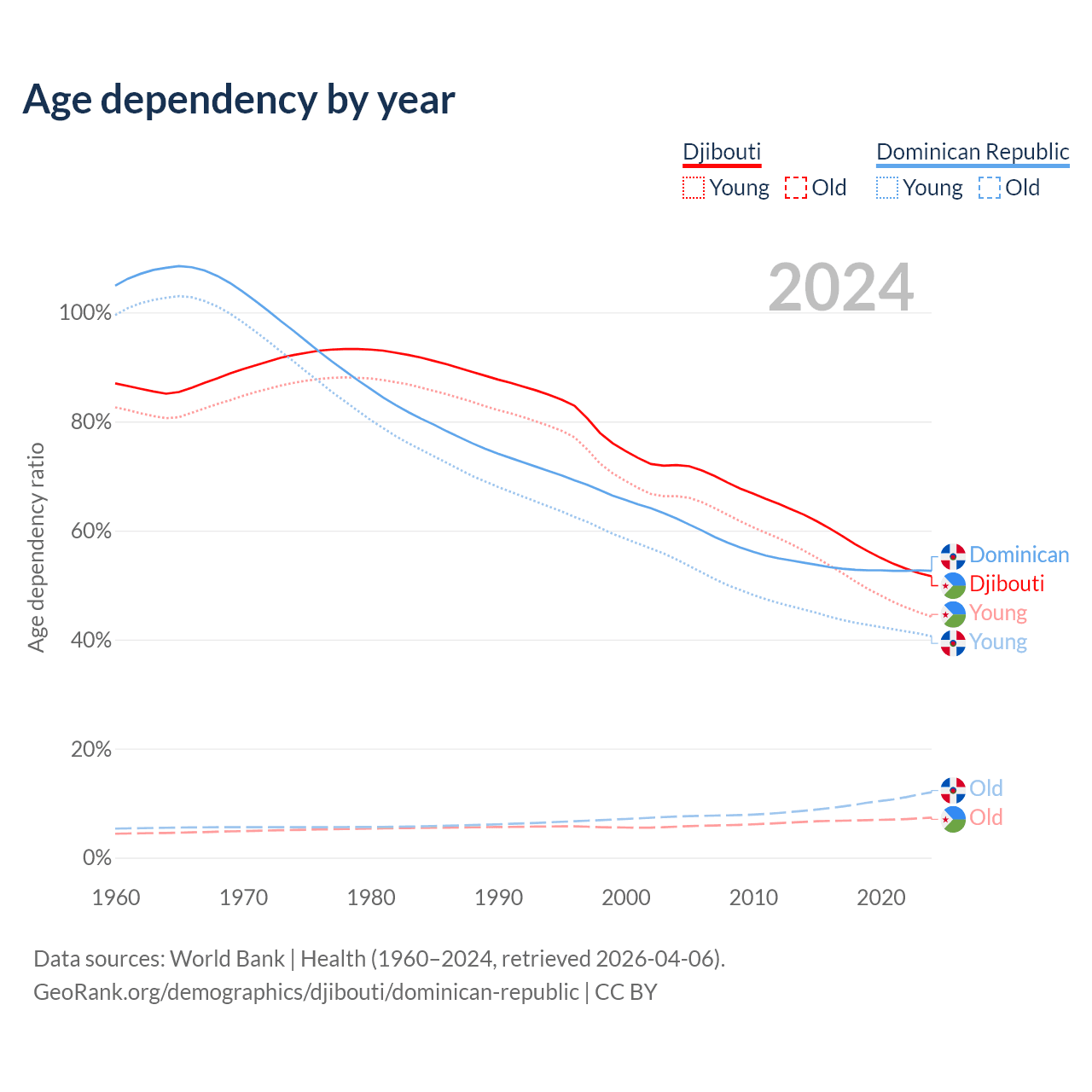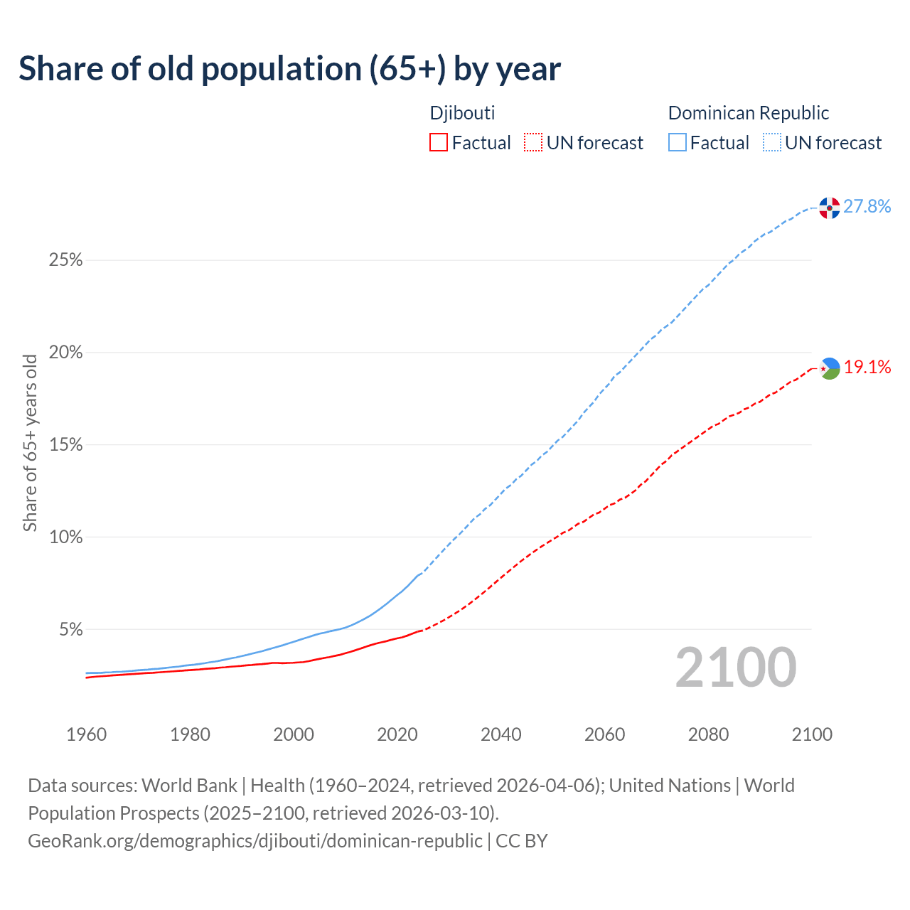 - The share of old-age demographic (65+) in Djibouti is 4.85% vs 7.88% in the Dominican Republic.