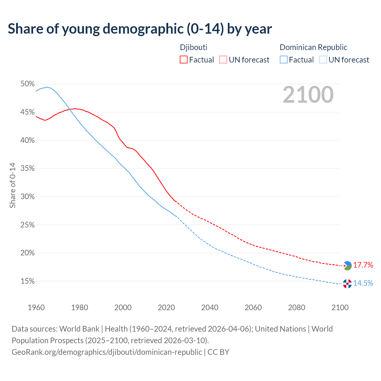 - The share of young demographic (0-15 years old) in Djibouti is 29.2% vs 26.6% in the Dominican Republic.