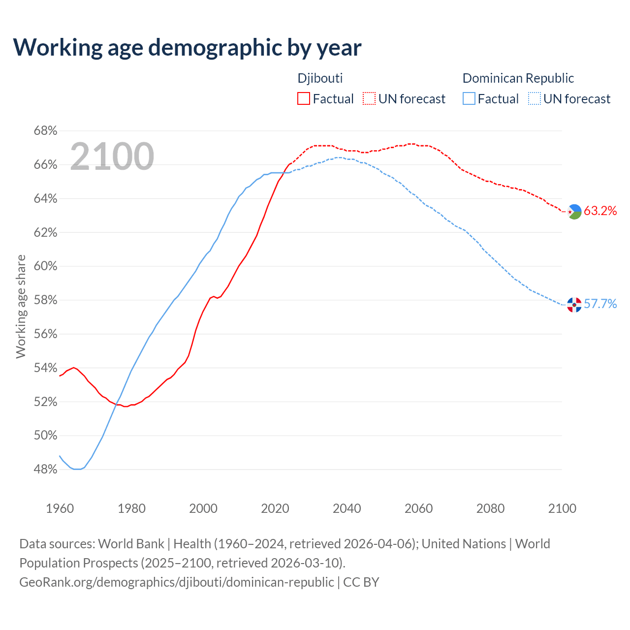 - Djibouti has 794K working age adults (aged 15-64) vs 7.63M in the Dominican Republic.