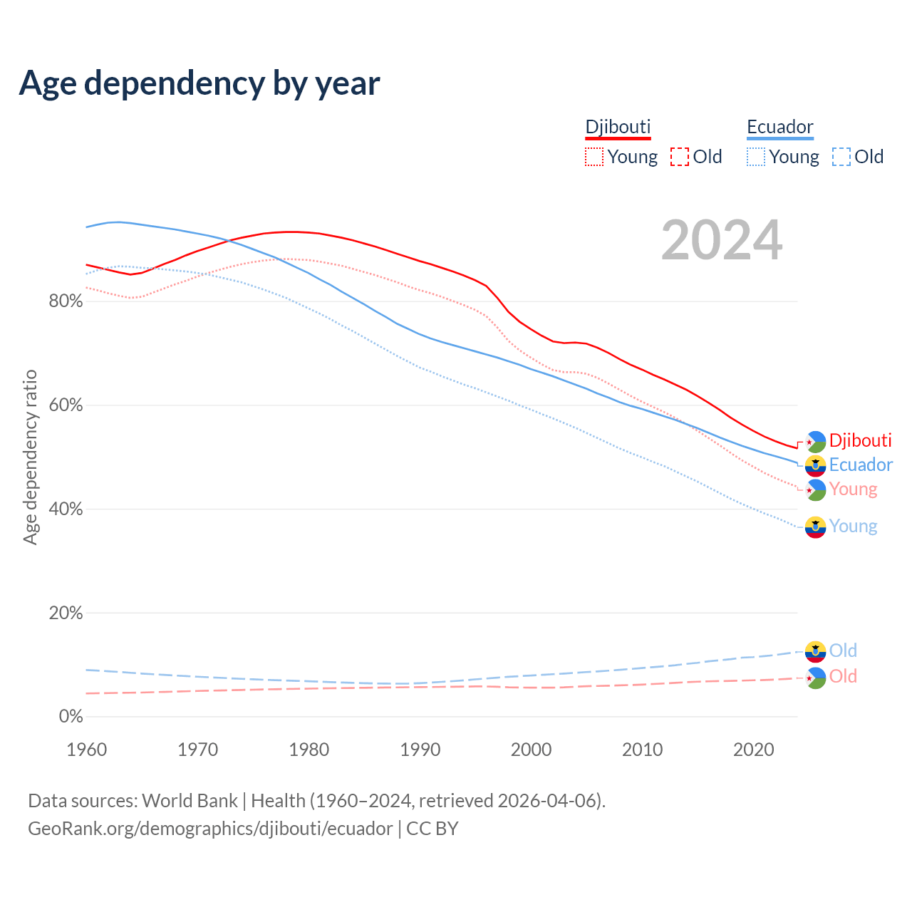 - The share of old-age demographic (65+) in Djibouti is 4.85% vs 8.34% in Ecuador.