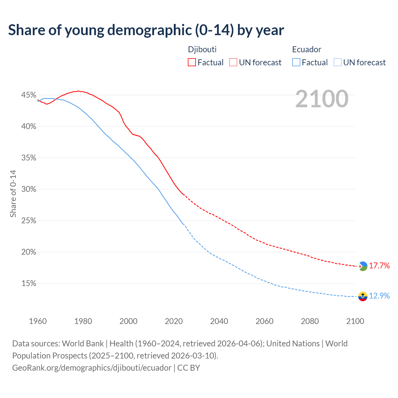 - The share of young demographic (0-15 years old) in Djibouti is 29.2% vs 24.5% in Ecuador.