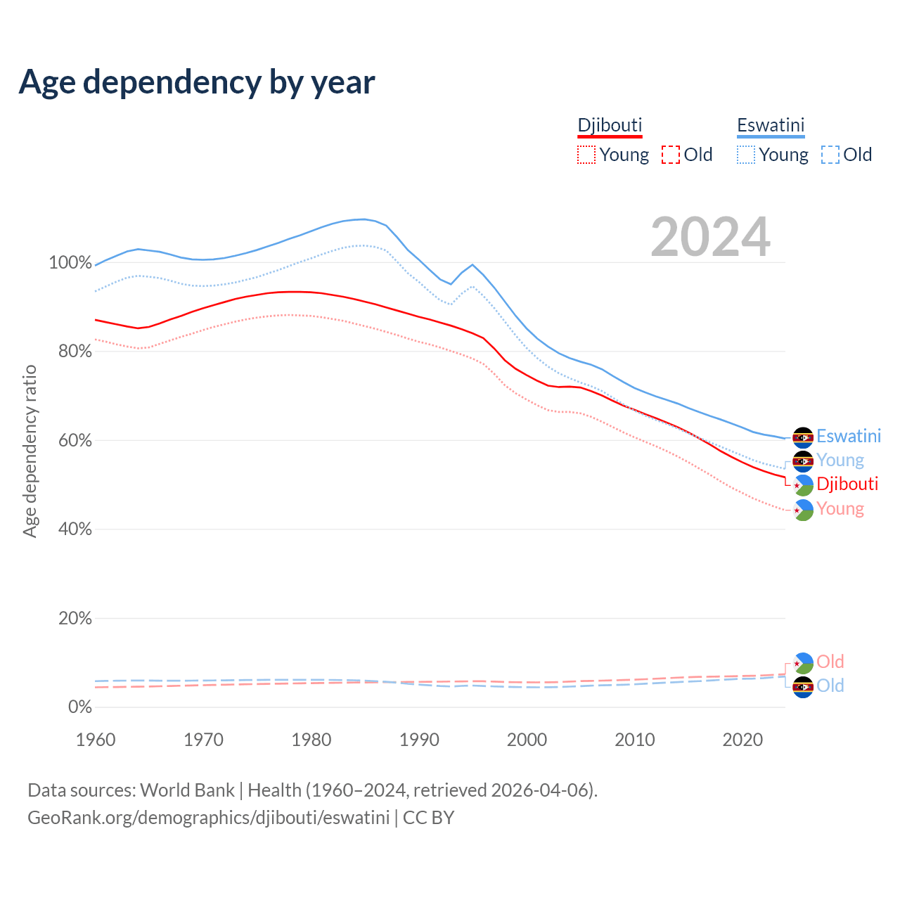 - The share of old-age demographic (65+) in Djibouti is 4.85% vs 4.26% in Eswatini.