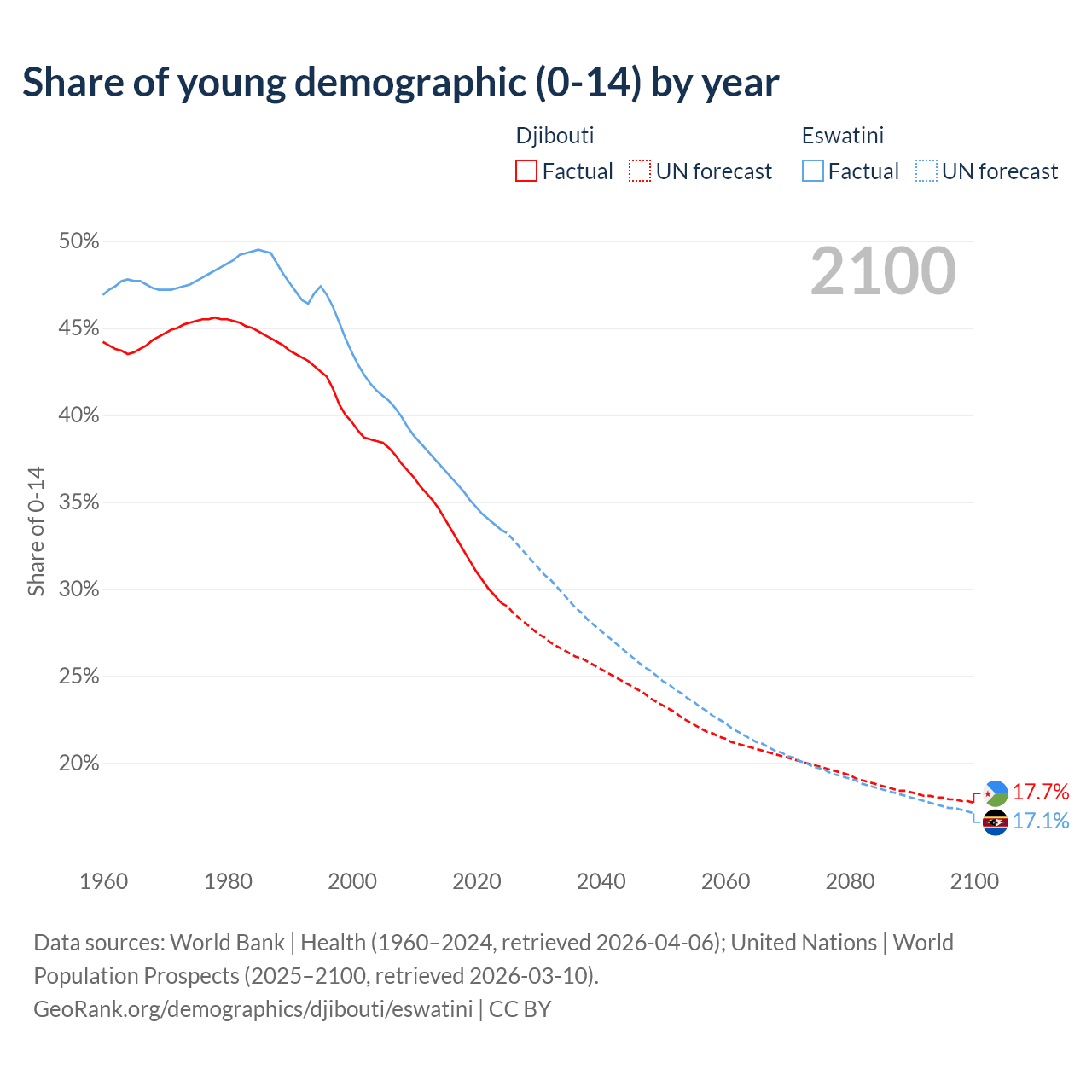 - The share of young demographic (0-15 years old) in Djibouti is 29.2% vs 33.4% in Eswatini.